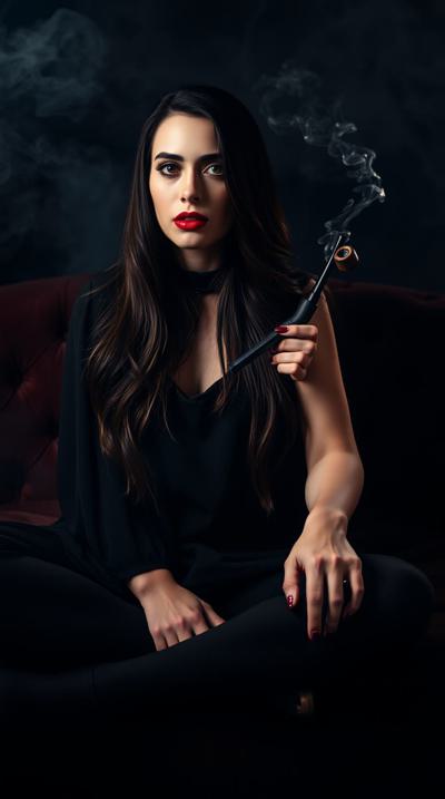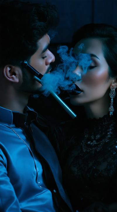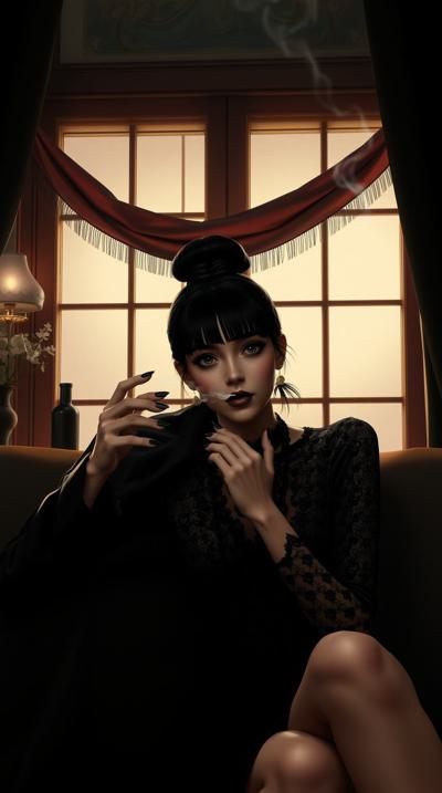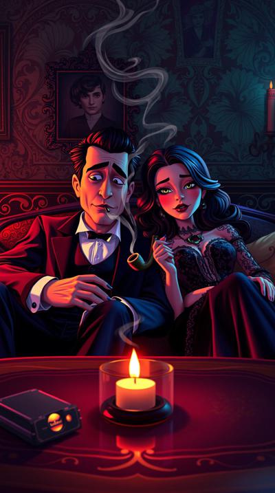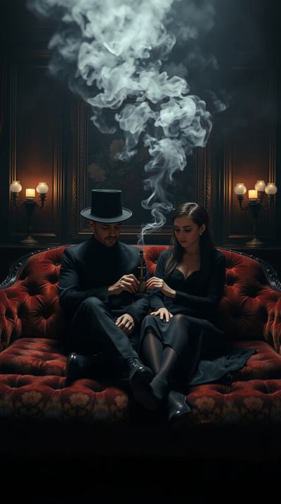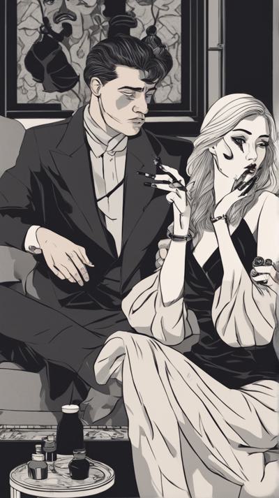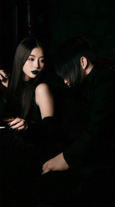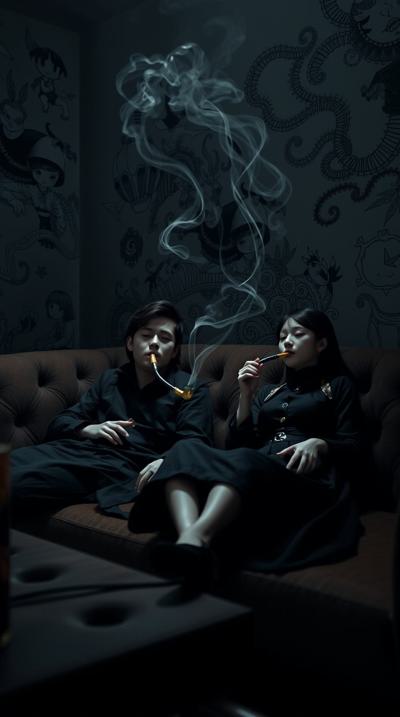 парень и девушка сидят дома курят опиум черные ногти, глаза и губы одеты во все черное в стиле анимации