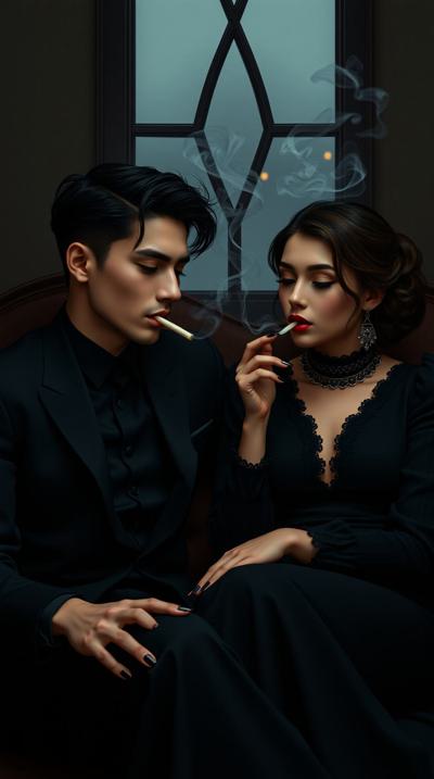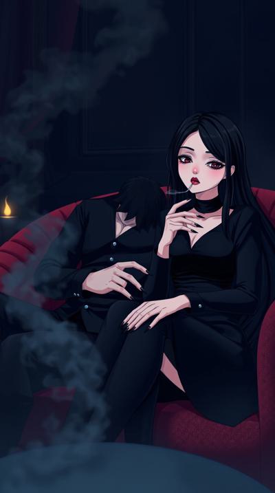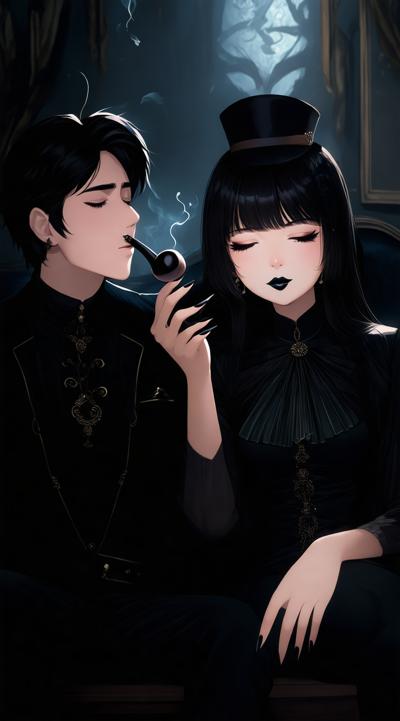 парень и девушка сидят дома курят опиум черные ногти и губы одеты во все черное в стиле анимации