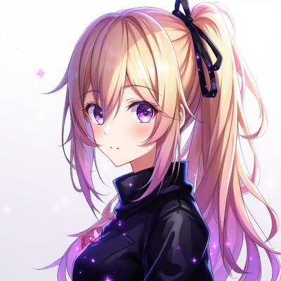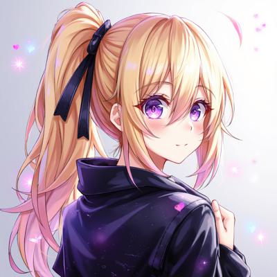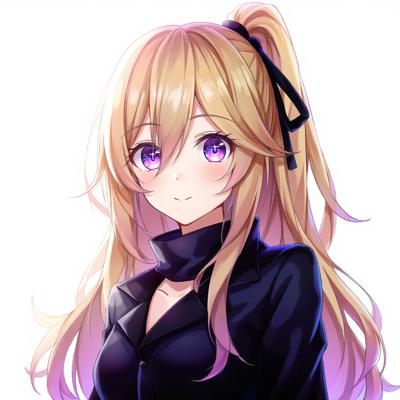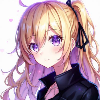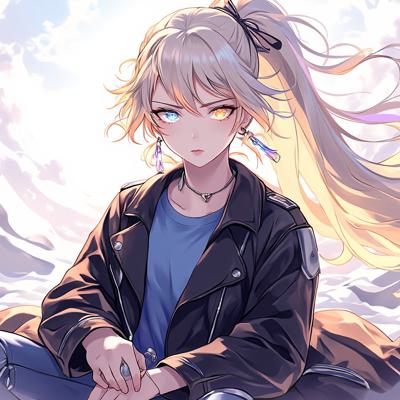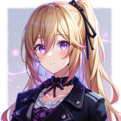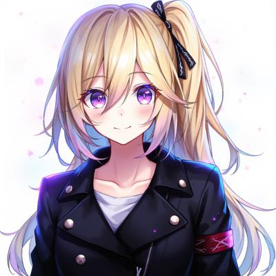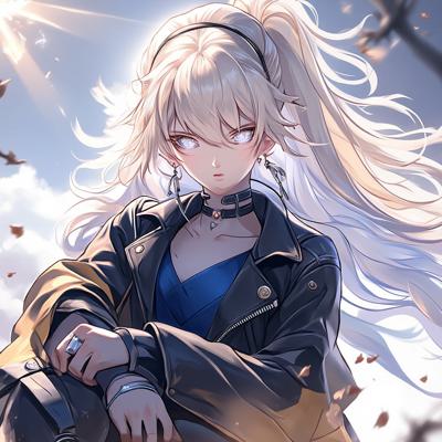 , Girl, 17 years old, Twisted Wonderland character style, Yana Tobosso's drawing style, blonde, straight stripes, medium-length high ponytail tied with a black thin ribbon, fair skin, elongated face, light blue eyes with sparcles as a mirror, smokey eye makeup, long eyelashes, black leather jacket, blue shirt, ring with a white stone on her left hand