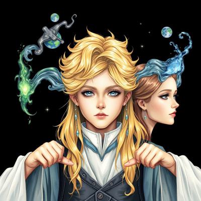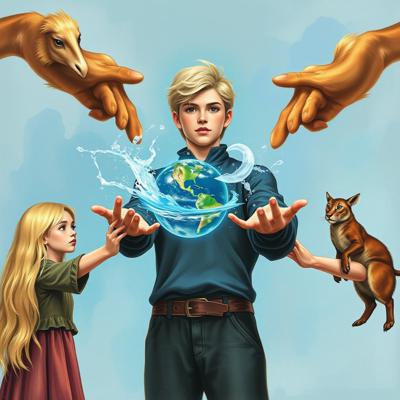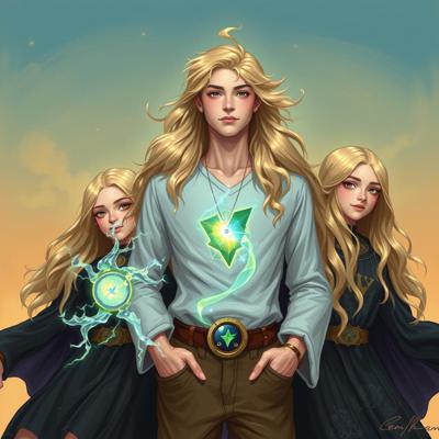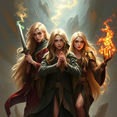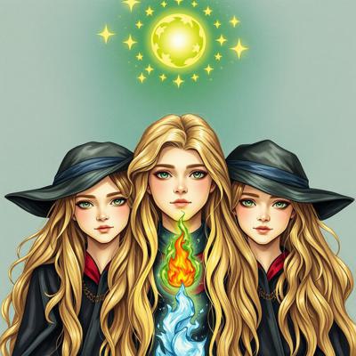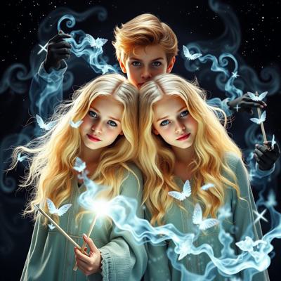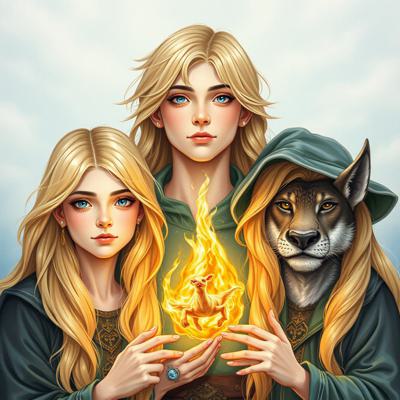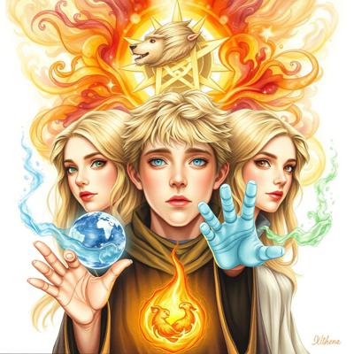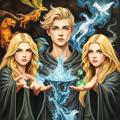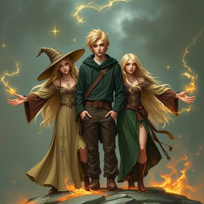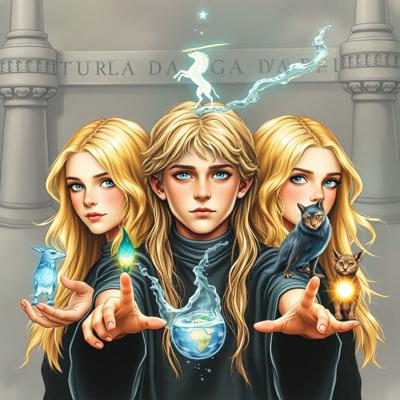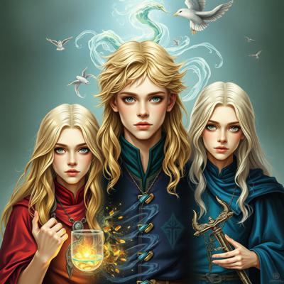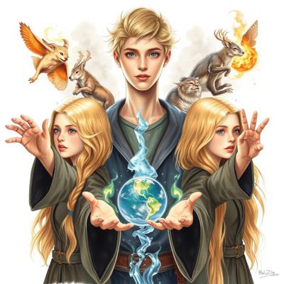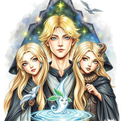 брат и две сестры близняшки, блондины, 18 лет, арт: брат по центру, сверху, сестры по бокам, композиция для рисунка, волшебники, управляют стихиями с помощью рук: брат - земля, одна сестра - вода, вторая - животные. Брат смотрит вперед, девушки в разные стороны