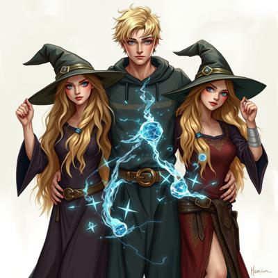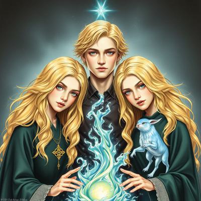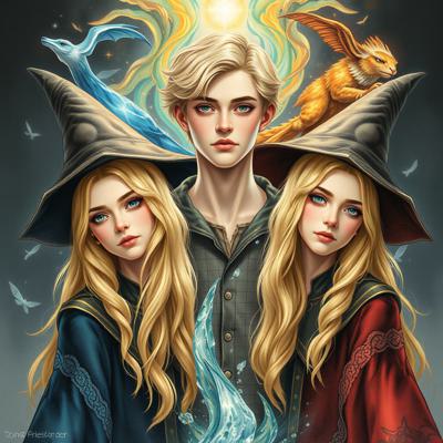 брат и две сестры близняшки, блондины, 18 лет, арт: брат по центру, сверху, сестры по бокам, композиция для рисунка, волшебники, управляют стихиями: брат - земля, одна сестра - вода, вторая - животные