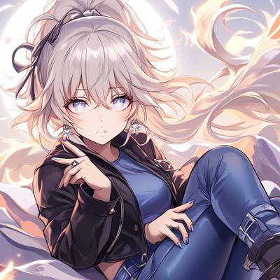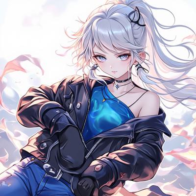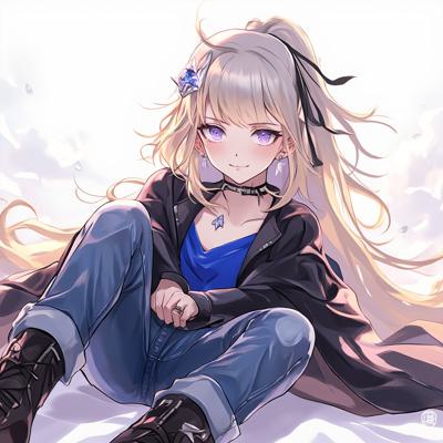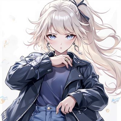1girl, teenager, slim, fair skin, blonde hair, white hair, off-white hair, straight hair, side-parted hair, high ponytail, thin black ribbon, hair accessory, blue eyes, sparkling eyes, mirror-like eyes, gray eyes, short black leather jacket, blue top, jeans, black boots, jewelry, earrings, ring on left hand, white stone ring, twisted wonderland style, original character, single character, full body, looking at viewer, anime style, simple background, white background