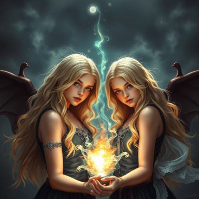 брат и две сестры близняшки, блондины, 18 лет, арт: брат сверху, сестры по-бокам, все по-пояс, волшебники, управляют стихиями