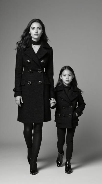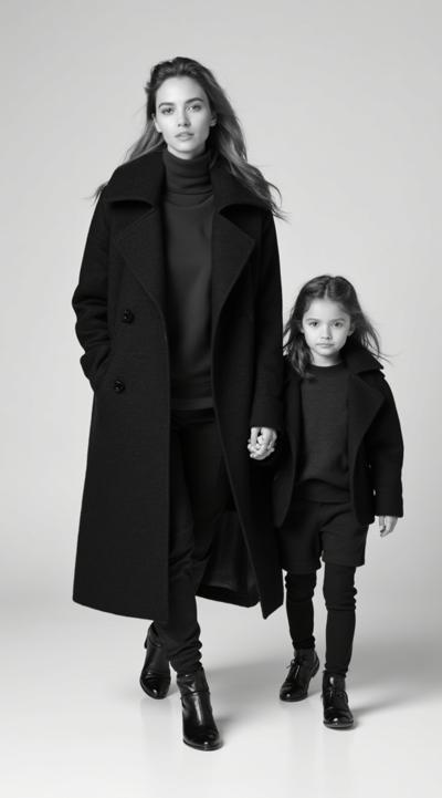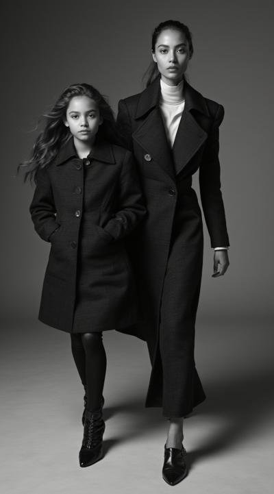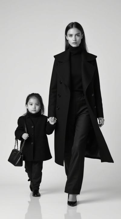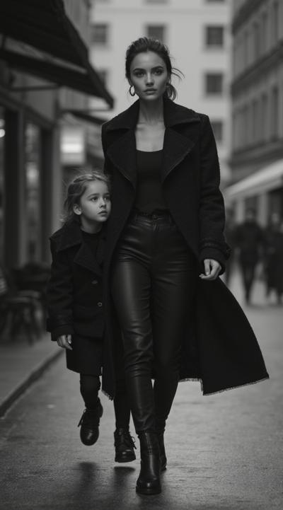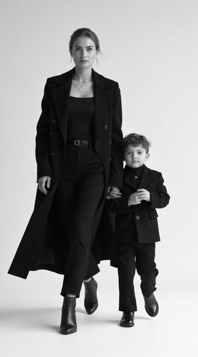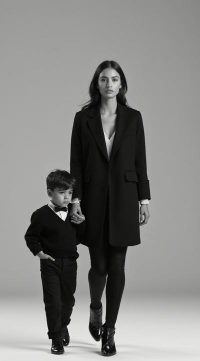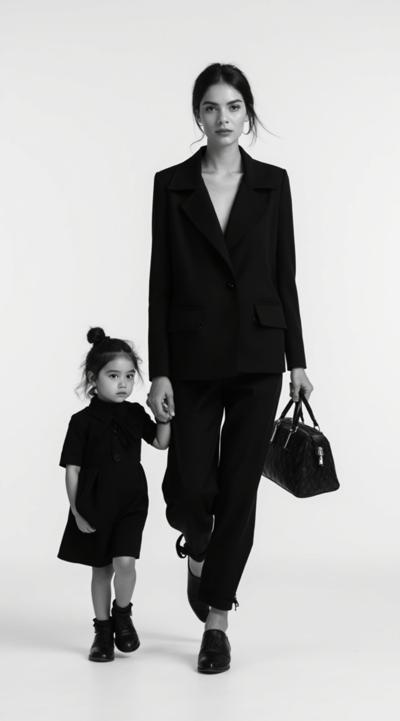 Elegant black and white Vogue fashion photo, confident stylish mother with child walking together, sophisticated luxury outfit, minimal modern background, calm confident energy, high fashion magazine photoshoot, full body composition,