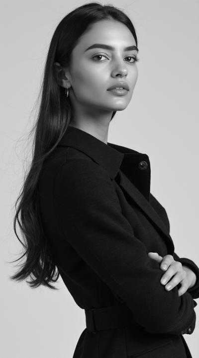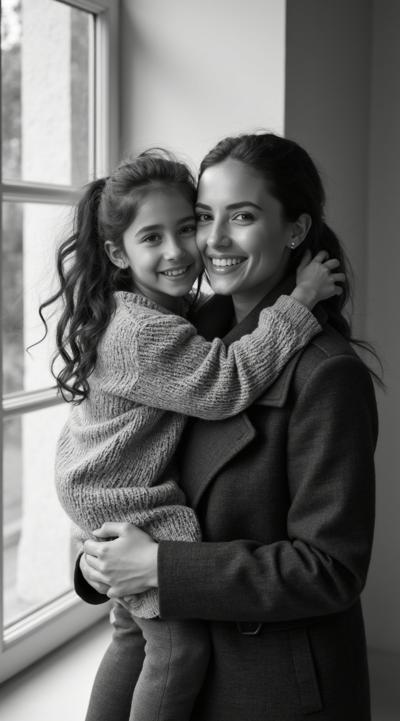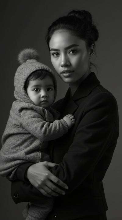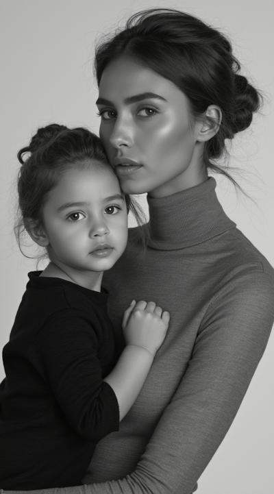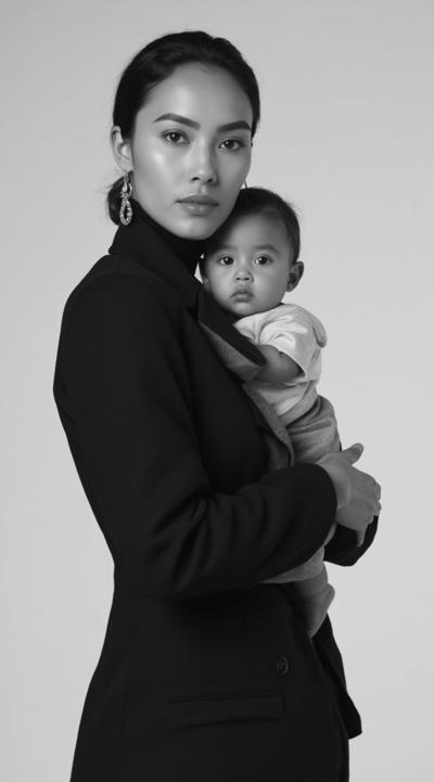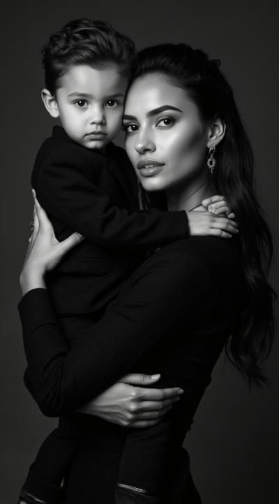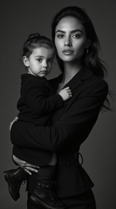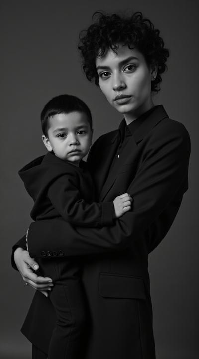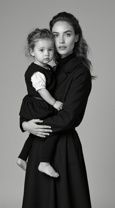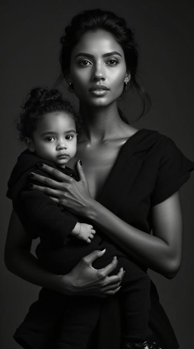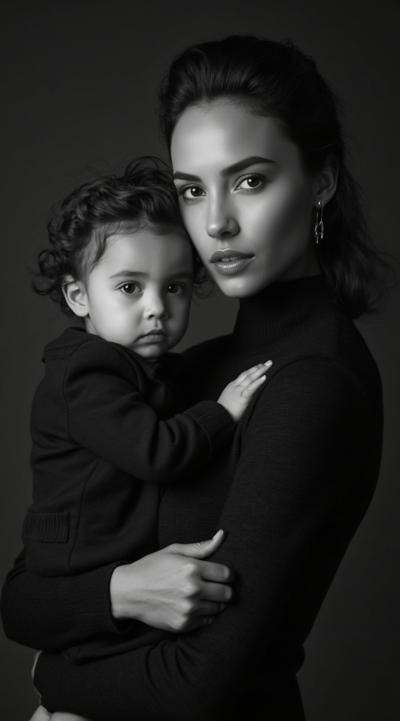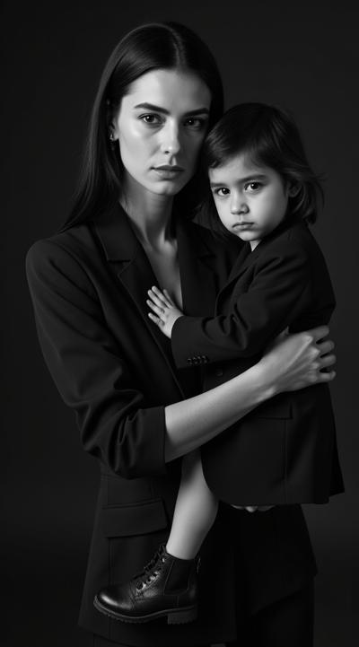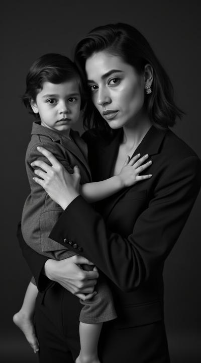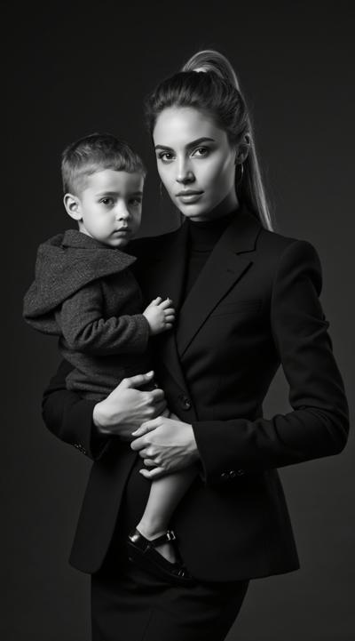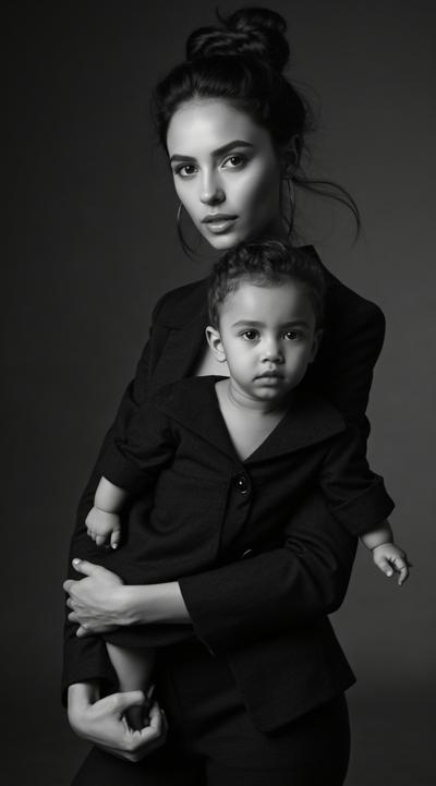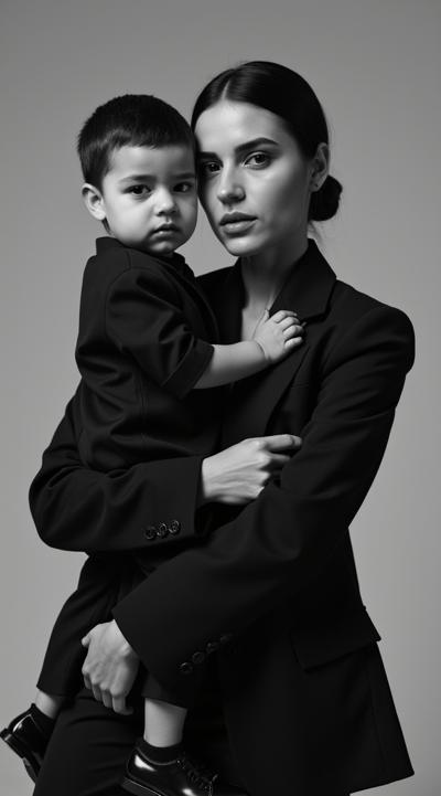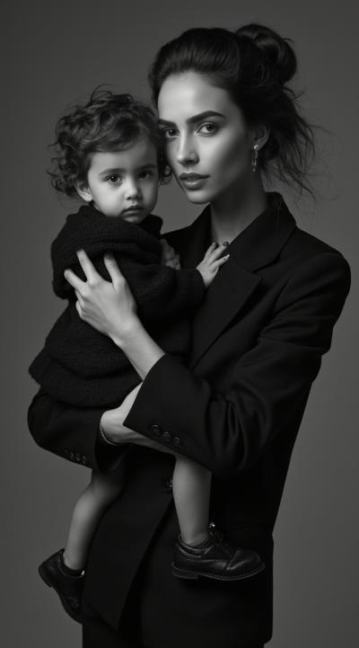 Black and white Vogue editorial portrait, confident powerful mother holding child, strong protective pose, intense eye contact, elegant structured outfit, dramatic studio lighting, luxury magazine fashion shoot, close-up portrait style, emotional strength and feminine power, ,