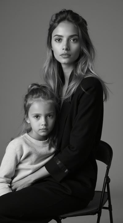 Black and white editorial fashion portrait, elegant composed mother with child, balanced symmetrical pose, minimal background, structured clothing, Dior style luxury photoshoot, calm authority, refined magazine aesthetic, ,