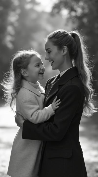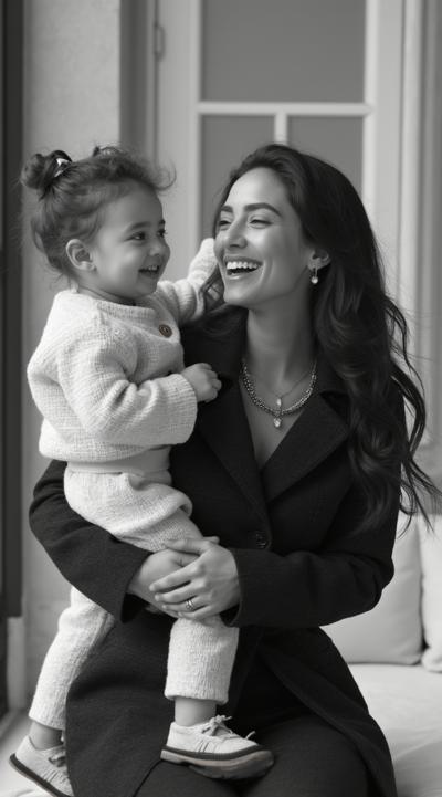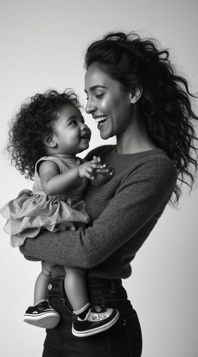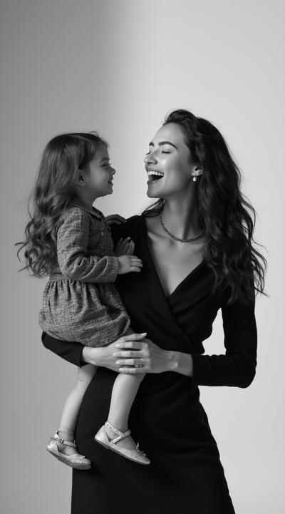 Bright black and white Vogue fashion editorial, joyful stylish mother with child laughing together, natural light, open emotional energy, luxury magazine photoshoot, fashionable modern clothing, full body lifestyle fashion frame,