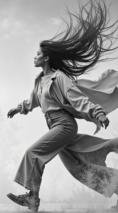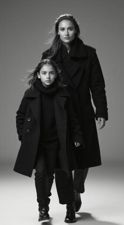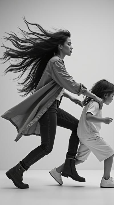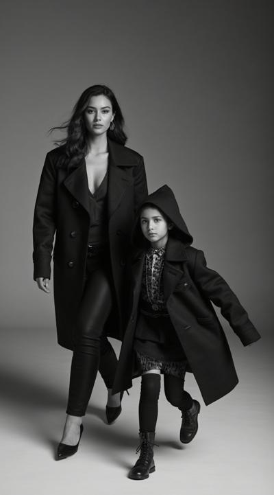 Dynamic black and white editorial fashion photo, confident mother leading child forward, strong movement, modern stylish outfit, Zara campaign style, dramatic lighting, powerful energy, luxury magazine shoot, sense of ambition and motion мама и ребенок в движении, ветер развивает волосы полет