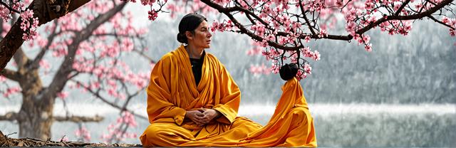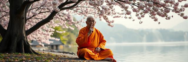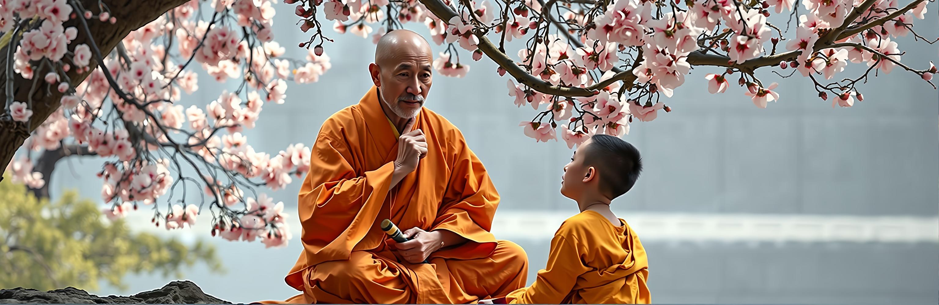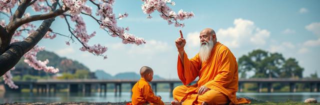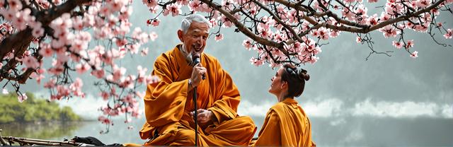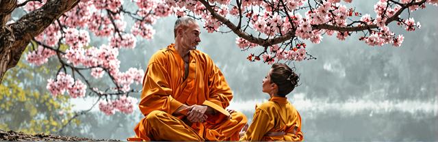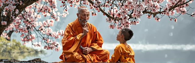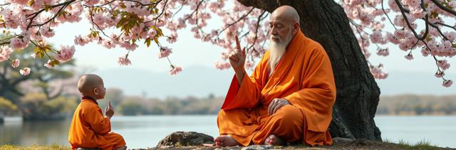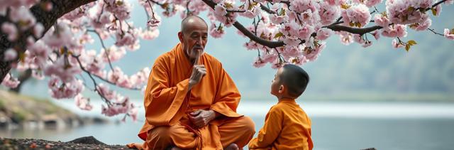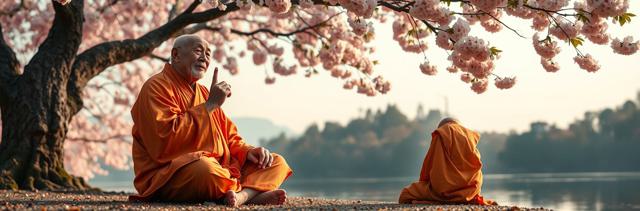 Пожилой восточный Учитель - гуру в оранжевом одеянии сидит, скрестив ноги, под цветущей сакурой на берегу реки. Он приложил указательный палец к губам, демонстрируя своему ученику знак молчи . Ученик сидит на коленях перед учителем и тоже одет в оранжевую одежду монаха.