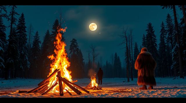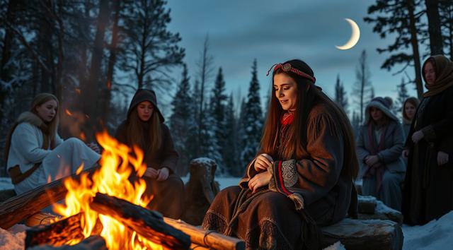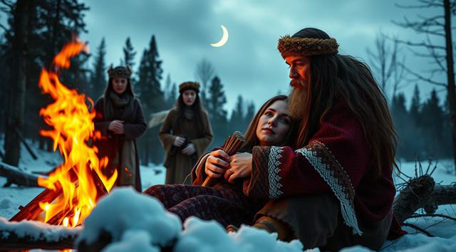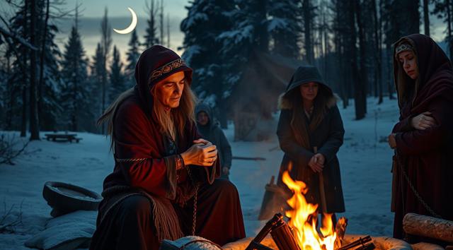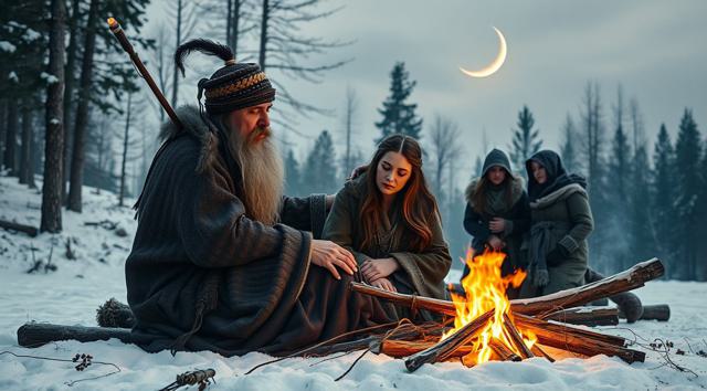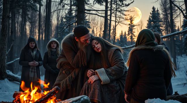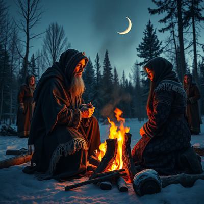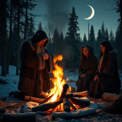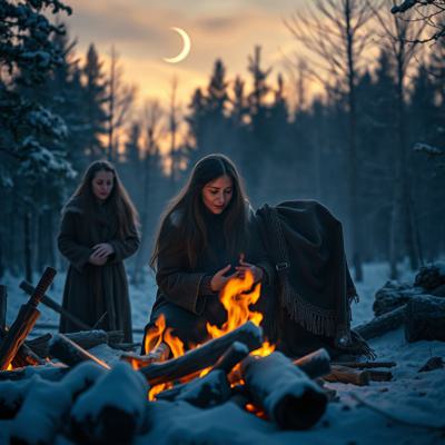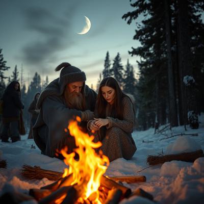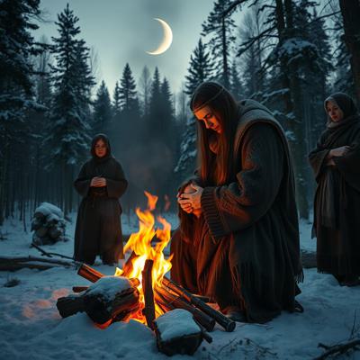 фотореализм 4:3 несколько вариантов: фотореализм 4:3 несколько вариантов: Изобрази сибирского шамана утешающего женщину славянской внешности с длинными русыми волосами. Действие происходит зимой у костра на лесной поляне. Вокруг стоят другие женщины. В небе виден серп молодой луны, отражающейся на льду замёрзшего озере. Обстановка таинственности