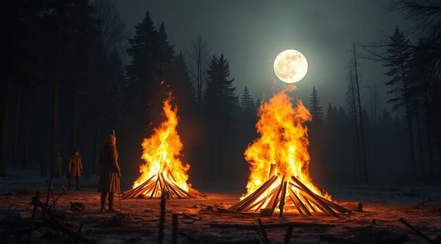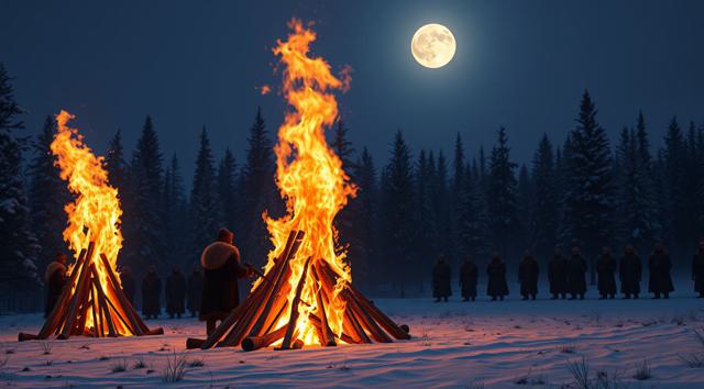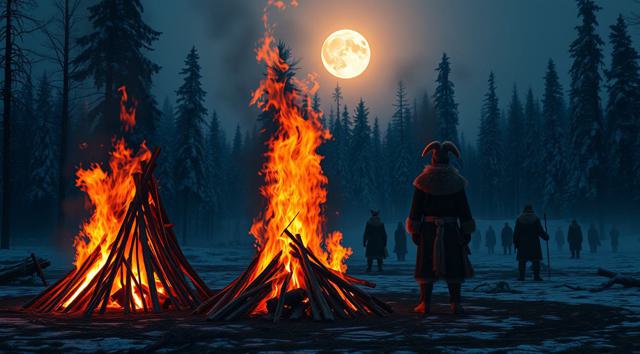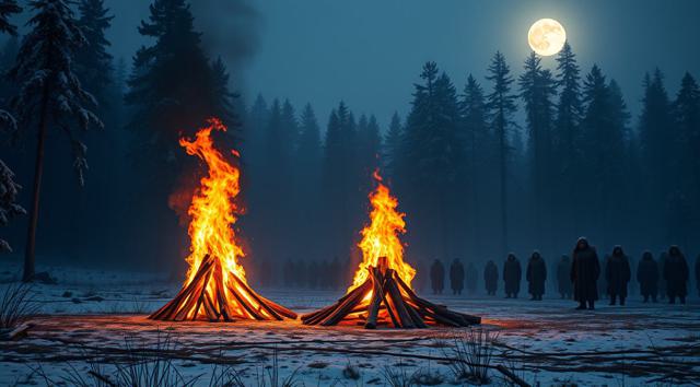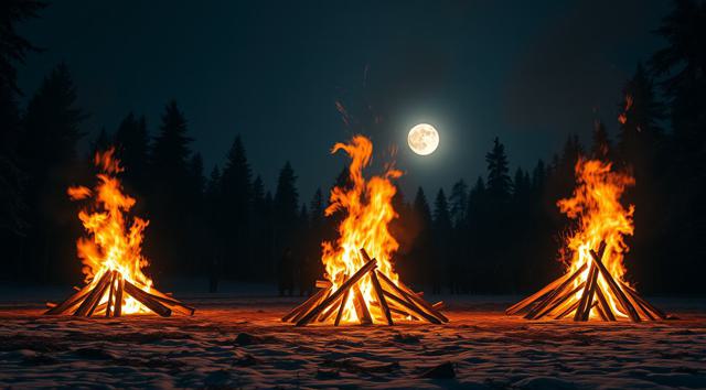 Фотореализм: три больших костра в полнолуние на зимней лесной поляне. В их свете на заднем плане стоит много людей в шаманских одеждах из меха