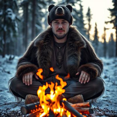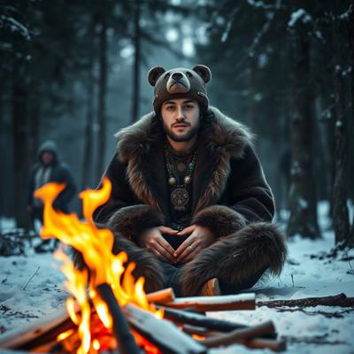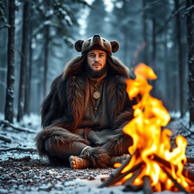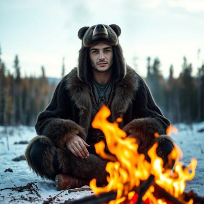 Молодой красивый сибирский шаман сидит скрестив ноги на поляне в зимнем лесу. Перед ним горит костёр. На лице и одежде видны отблески пламени.На шамане одета шуба из медвежьей шерсти, а на голове шапка с медвежьей мордой. Шуба распахнута и на груди шамана видны шаманские амулеты. За спиной у него на звёздном небе горит большой зодиакальный круг с изображениями животных. Обстановка таинственности.