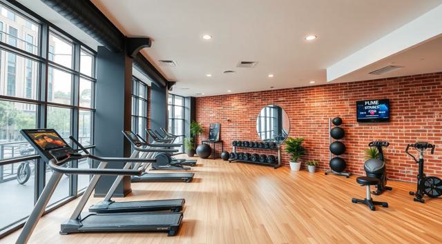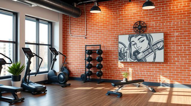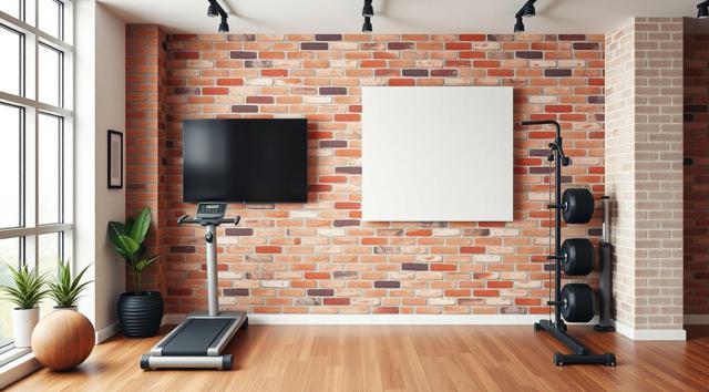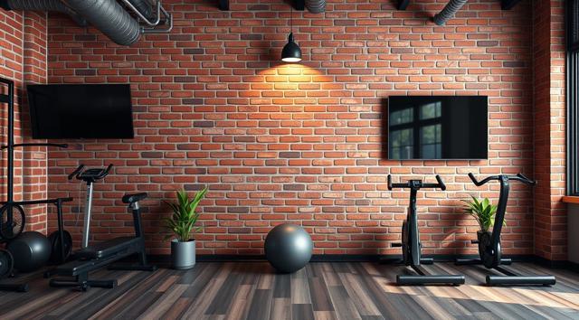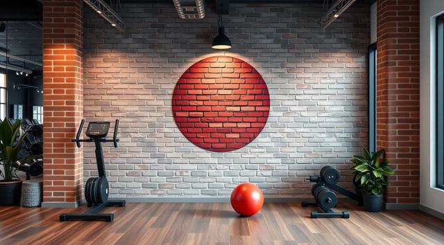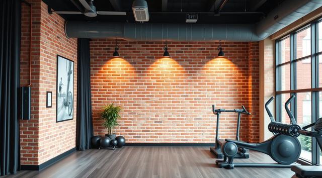 тренажерный зал современное стильное изображение, отделка стен красным кирпичем