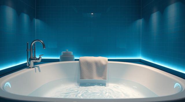 купель под звёздным небом, с внутренним освещением, с водой в которой чистая сияющая вода с пузырьками газа озона, сияние расходится вокуруг купели ,приготовлены чистые полотенца и флаконы с озонированным маслом и кремом в баночке с черной крышкой и голубым цветом крема внутри прозрачной емкости для крема премиум уровня, кажущееся волшебство научныого прогресса, неоновая голубоватая подсветка под ванной