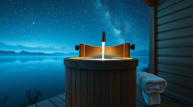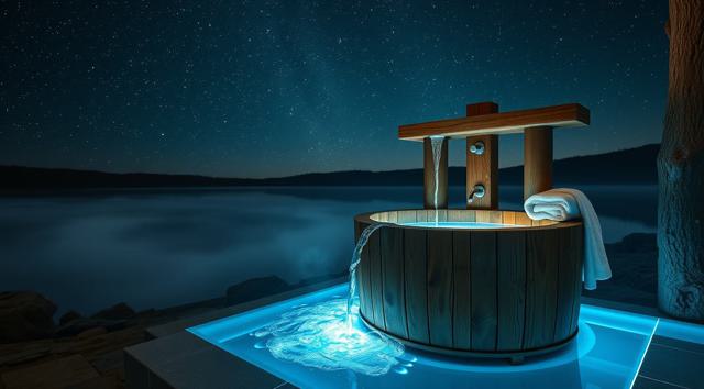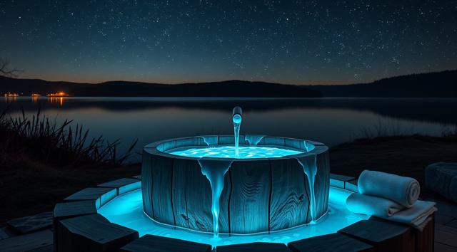 дубовая купель под звёздным небом у озера ночью, с внутренним освещением, с водой в которой чистая сияющая вода с пузырьками газа озона, сияние расходится вокуруг купели , приготовлены чистые полотенца, кажущееся волшебство научныого прогресса, неоновая голубоватая подсветка под ванной