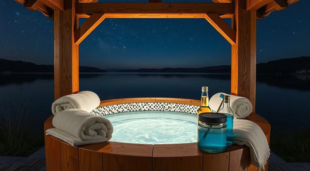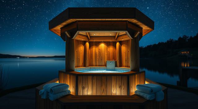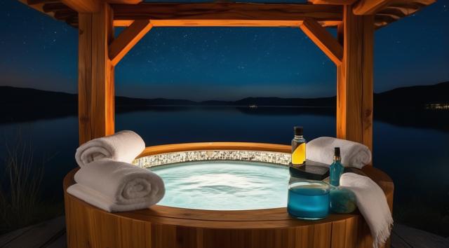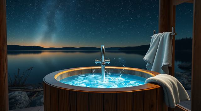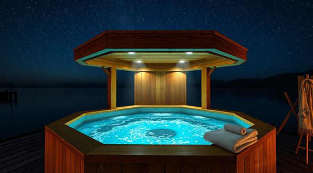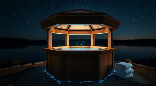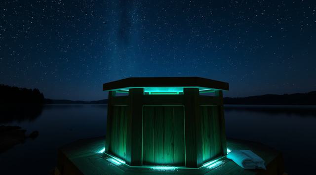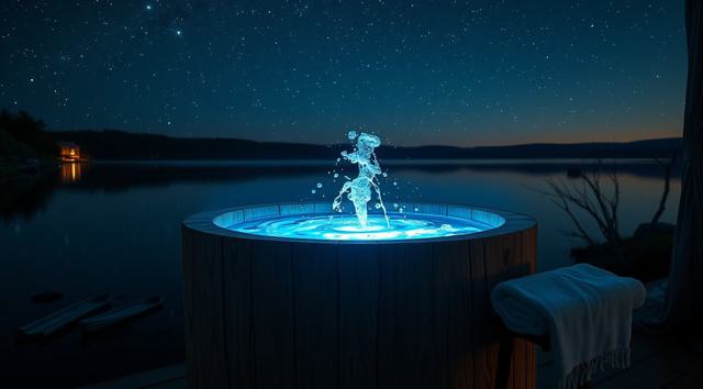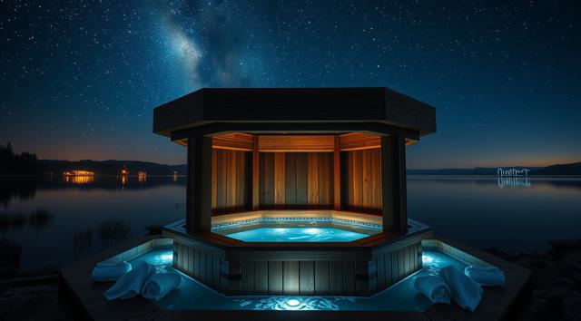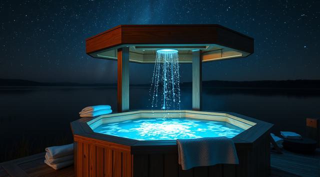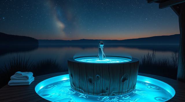 большая восьмигранная дубовая купель под звёздным небом у озера ночью, с внутренним освещением, с водой в которой чистая сияющая вода с пузырьками газа озона, сияние расходится вокуруг купели , приготовлены чистые полотенца, кажущееся волшебство научныого прогресса, неоновая голубоватая подсветка под ванной