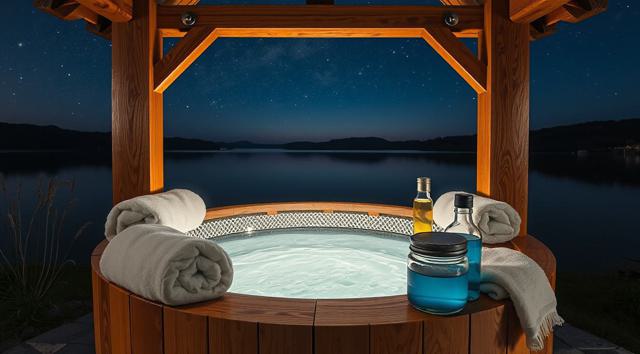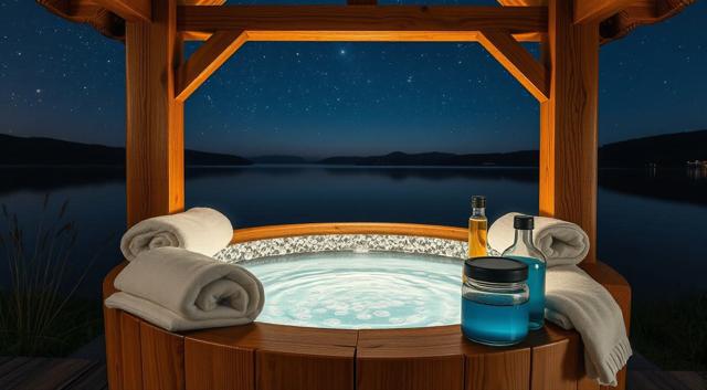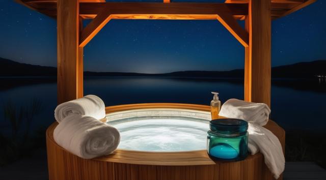 дубовая купель под звёздным небом у озера ночью, с внутренним освещением, с водой в которой чистая сияющая вода с пузырьками газа озона, сияние расходится вокуруг купели ,приготовлены чистые полотенца и флаконы с озонированным маслом и кремом в баночке с черной крышкой и голубым цветом крема внутри прозрачной емкости для крема премиум уровня, кажущееся волшебство научныого прогресса, неоновая голубоватая подсветка под ванной