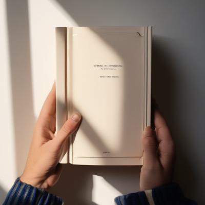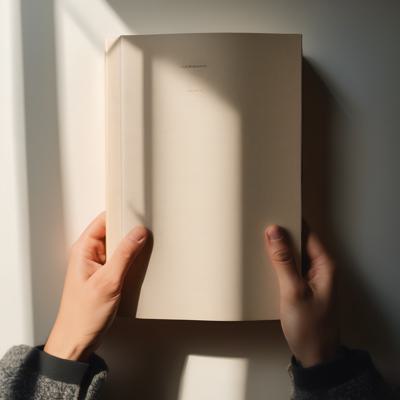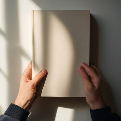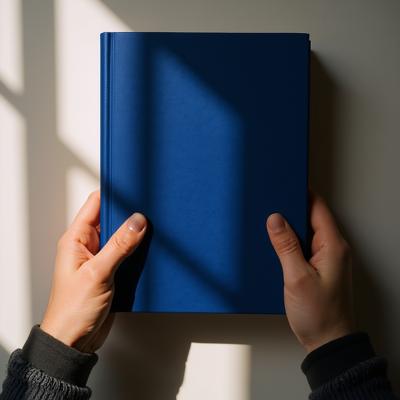 новая книга темно-синего цвета, края ровные. [Уточнение для #5756917 'фото закрытая книга в мужских руках, с монотонной обложкой, фото на белом фоне, крупно книга, вид через плечо, лица не видно, свет теплый. никаких деталей интерьера, белая стена свет падает слева, небольшая тень на стене от книги ]'