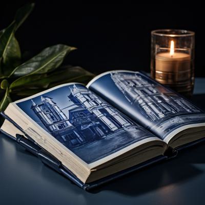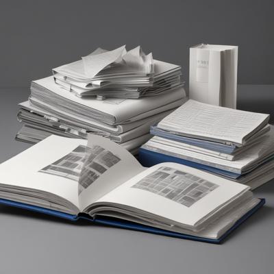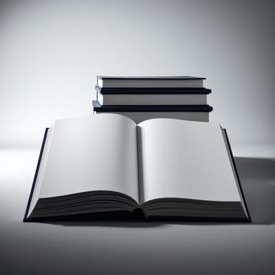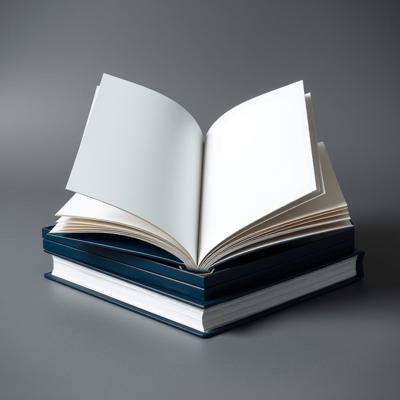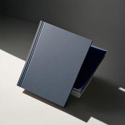 фото новой книги стоит на кубе в фотостудии (в архитектурном стиле), для архитектурного сайта. книги только что отпечатаны, с однотонной обложкой без текста и рисунка, на сером фоне, свет контровой. сзади раскрытой книги стопка аккуратно сложенных новых отпечатанных на типографии книг в темно-синей обложке, свет холодный, студийный. никаких деталей интерьера, белая стена, свет падает слева, небольшая тень на стене от книг