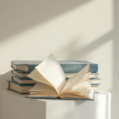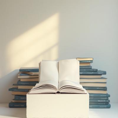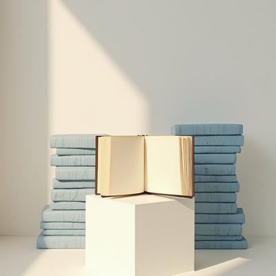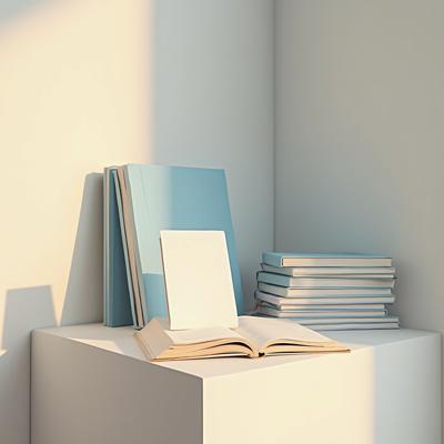 фото закрытая книга стоит на кубе в фотостудии, с однотонной обложкой без текста и рисунка, на светлом фоне, сзади раскрытой книги стопка аккуратно сложенных книг в синей обложке, свет теплый. никаких деталей интерьера, белая стена, свет падает слева, небольшая тень на стене от книг