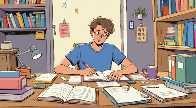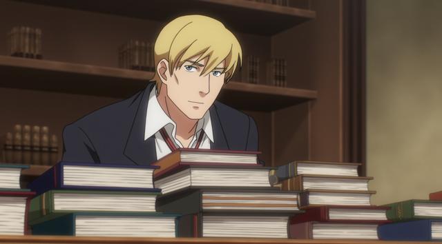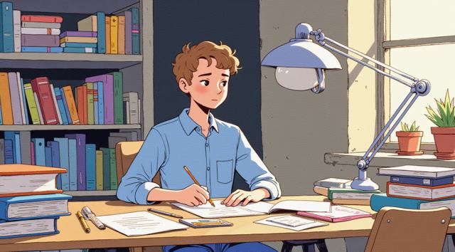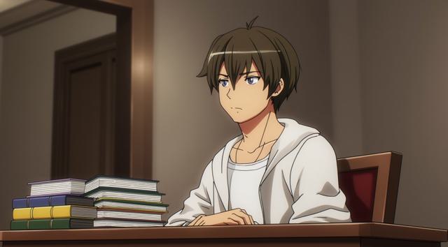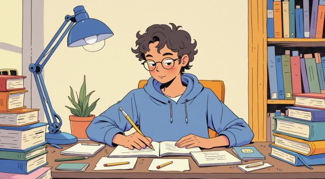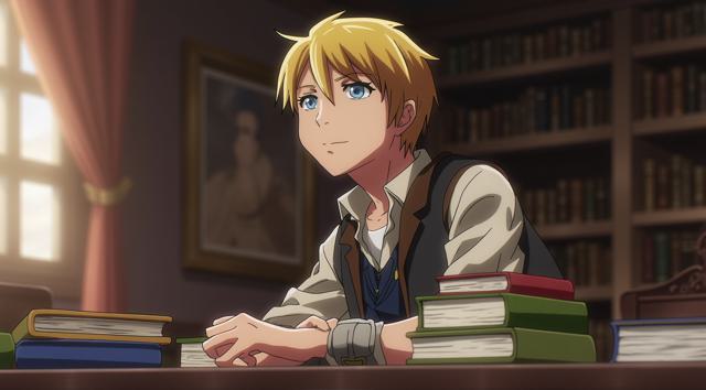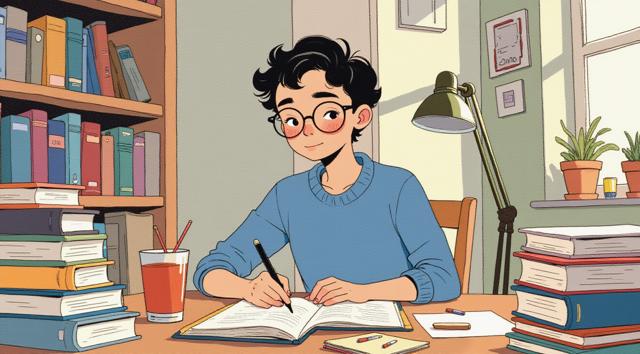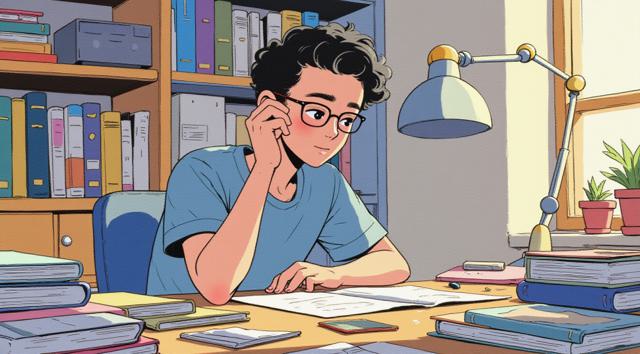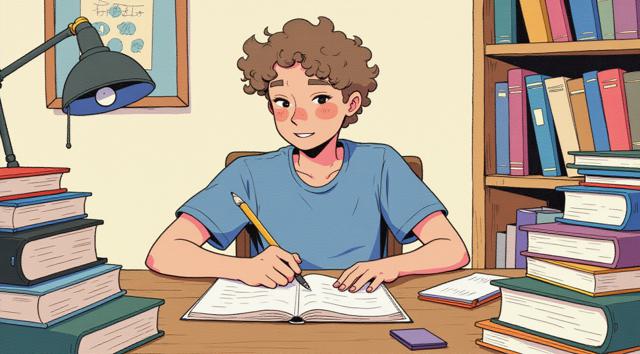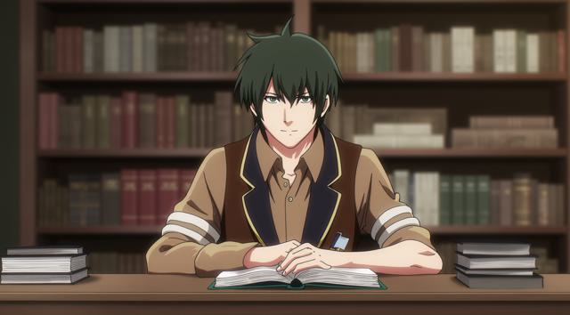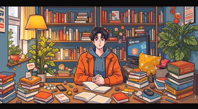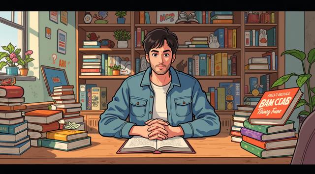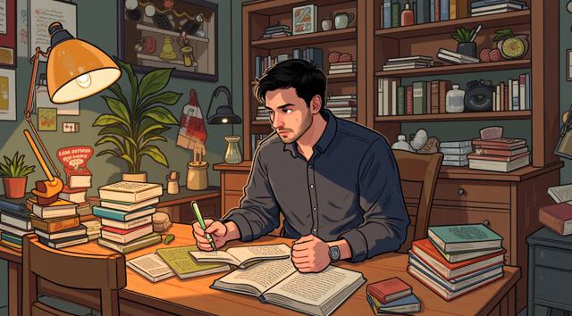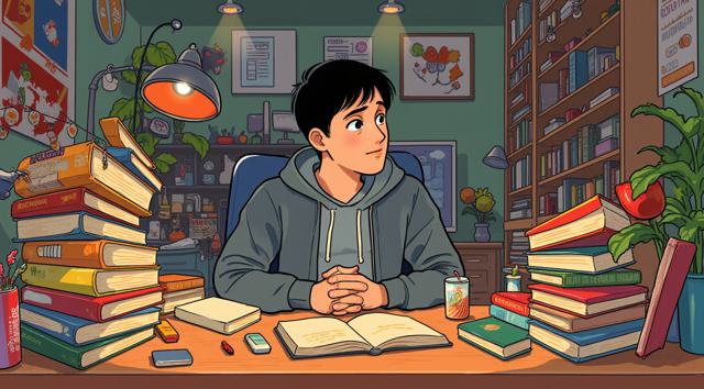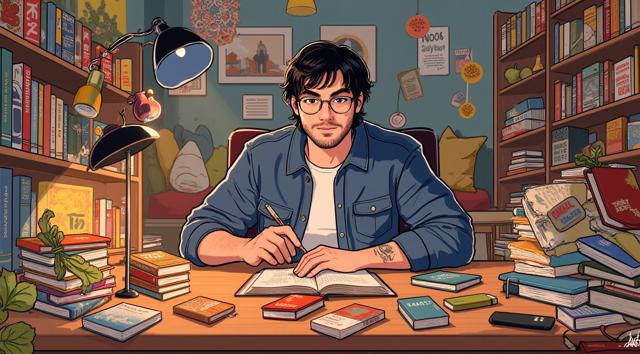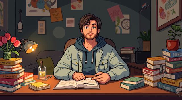 Парень 30 лет сидит за столом, на котором стоят много разных книг