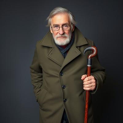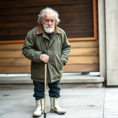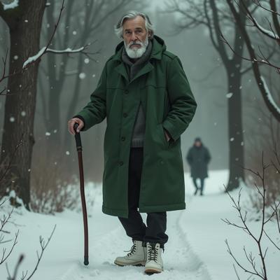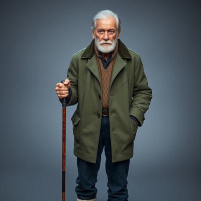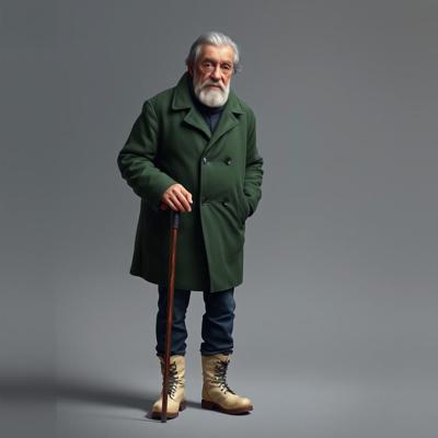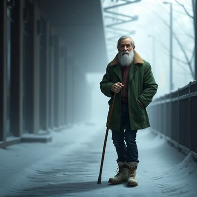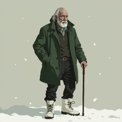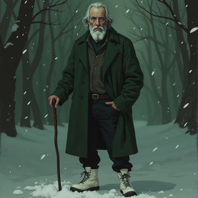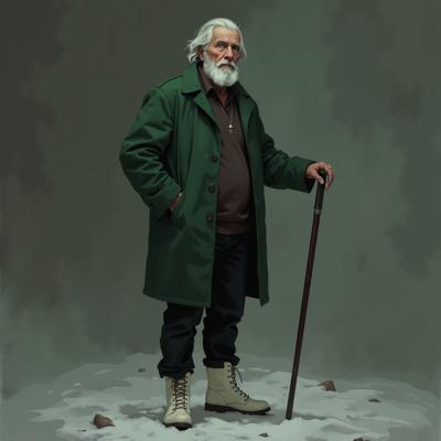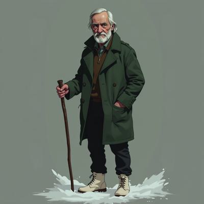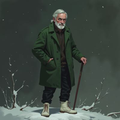 Старик 60 лет. Уставший. 180 сантиметров рост. Внешность: зелёные глаза, седые волосы до плеч, седая бодода до груди. Одет в зелёное пальто до колен, чёрные джинсы, зимние белые ботинки. В правой руке держит трость.