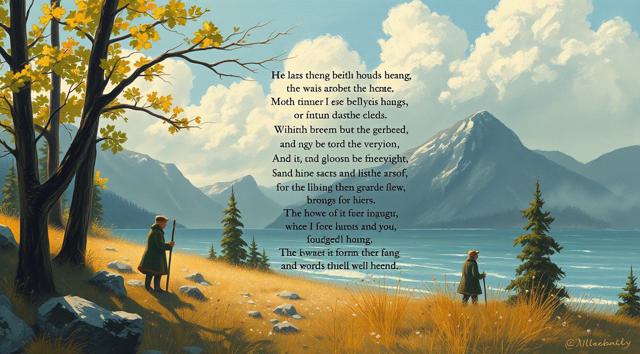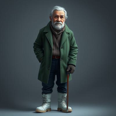 В стиле fantasy. Старик 60 лет. Уставший. 180 сантиметров рост. Внешность: зелёные глаза, седые волосы до плеч, седая бодода до груди. Одет в зелёное пальто до колен, чёрные джинсы, зимние белые ботинки. В правой руке держит трость.
