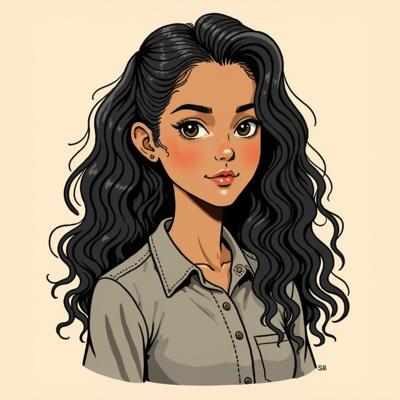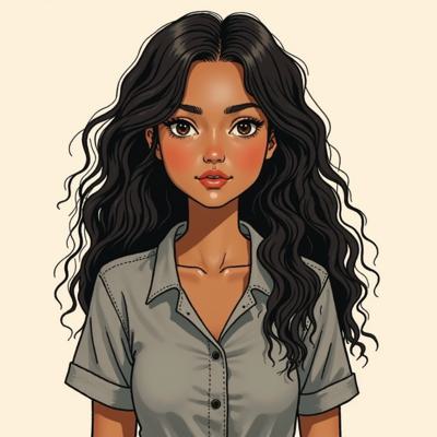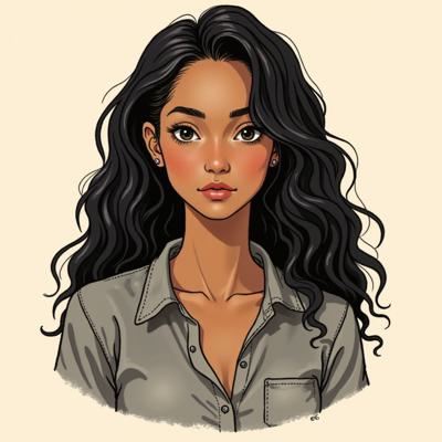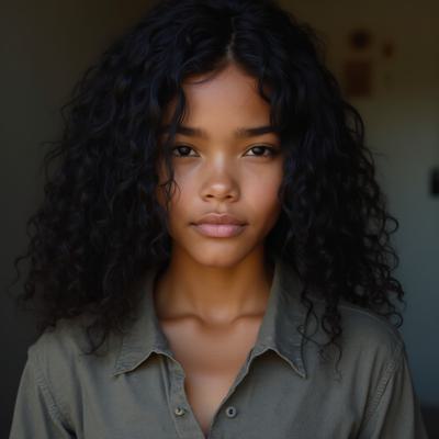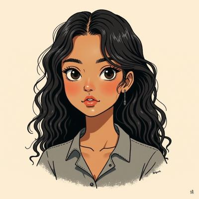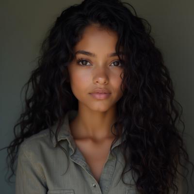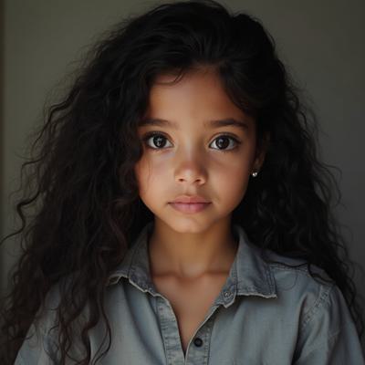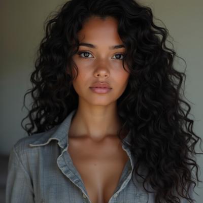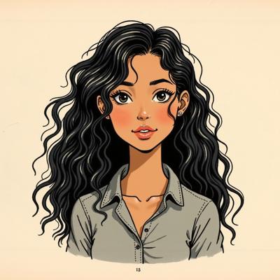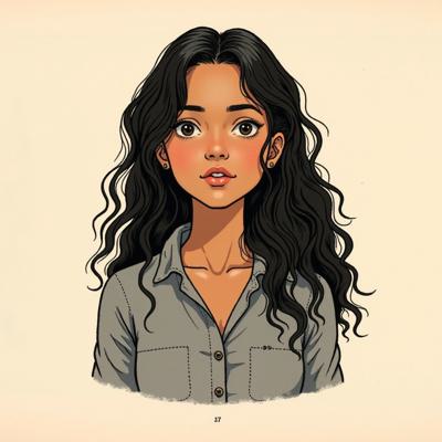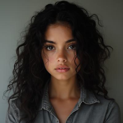 Нарисуй девушку-латиноамериканку лет 17 с длинными чёрными вьющимися волосами, мягко обрамляющими лицо, чёрные глаза, пухлые губы, гладкая кожа, на ней одета простая серая рубашка из грубой ткани без пуговиц и воротника