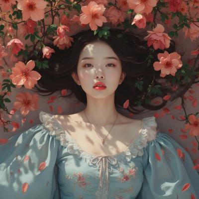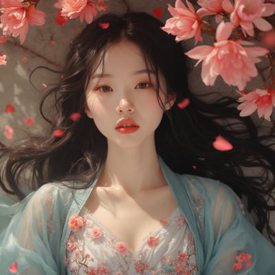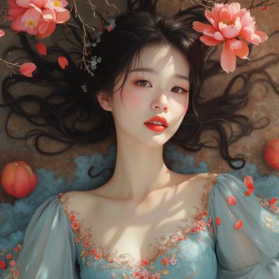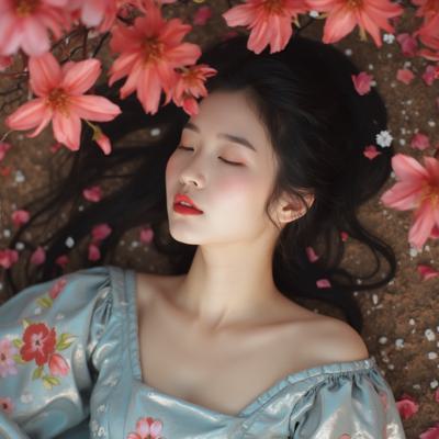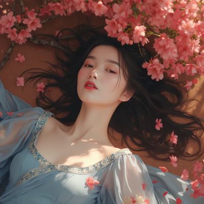 Красивая девушка с правильными чертами лица, бледной кожей и алыми губами. Девушка 25 лет, китаянка 18 века, одета в серебристо-голубое платье, у которого рукава расшиты магнолиями. Она лежит под цветущим деревом персика. Налетел порыв ветра, и персиковые лепестки, шурша, красным ливнем хлынули на землю, покрыв её с ног до головы и окрасив алым ее серебристо-голубое платье. Темно-красные лепестки кружились, застилая небо.