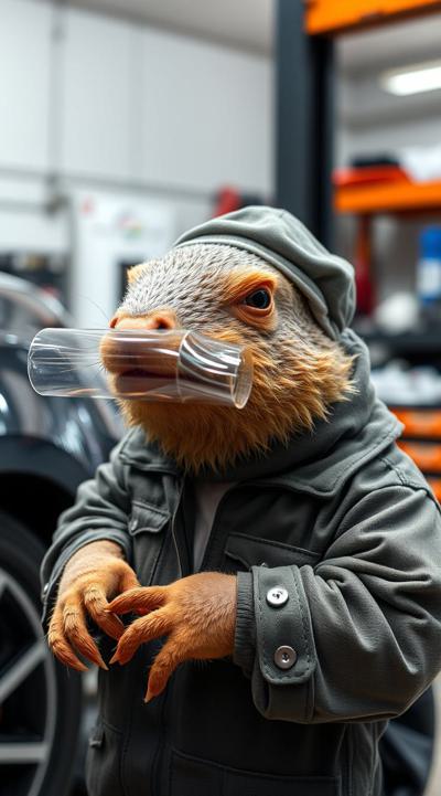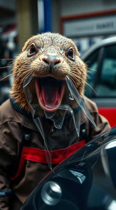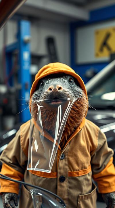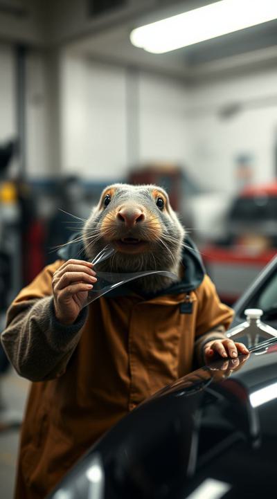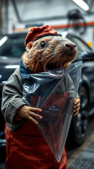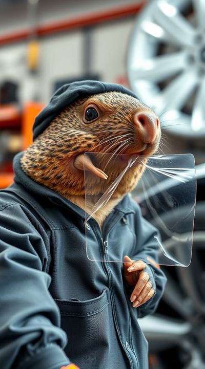 Создай изображения крота, который засунул себе в рот прозрачную полиуретановую плёнку на машине. крот одет в костюм механика, на фоне детейлинг, мастерская по тюнингу автомобилей