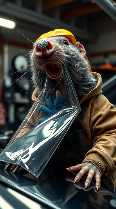 Создай изображения крота, который засунул себе в открытый рот прозрачную полиуретановую плёнку на машине. крот одет в костюм механика, на фоне детейлинг, мастерская по тюнингу автомобилей