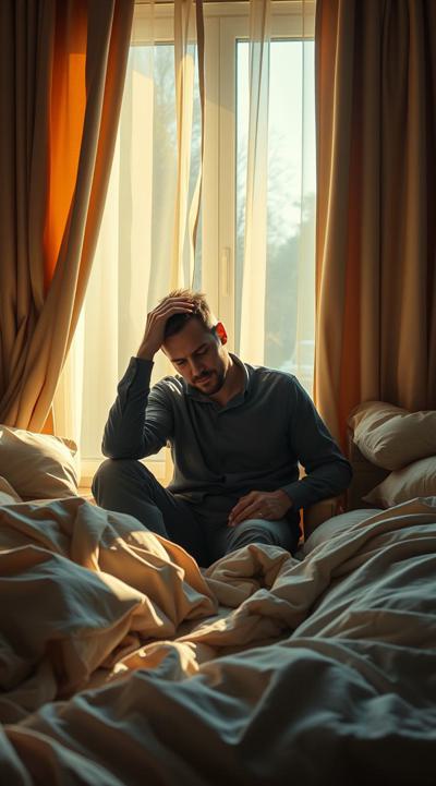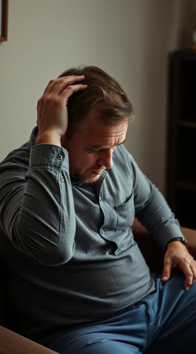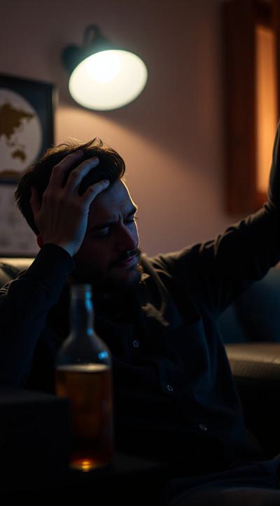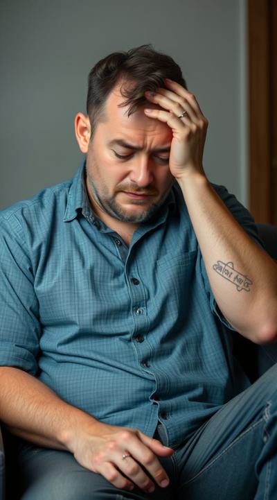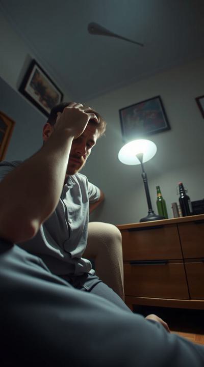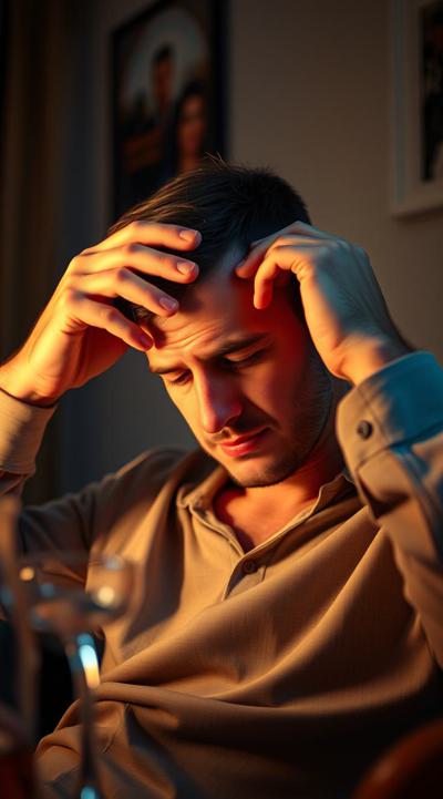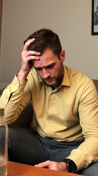 У мужчины похмелье. он сидит в комнате, у него болит голова, он держит рукой голову