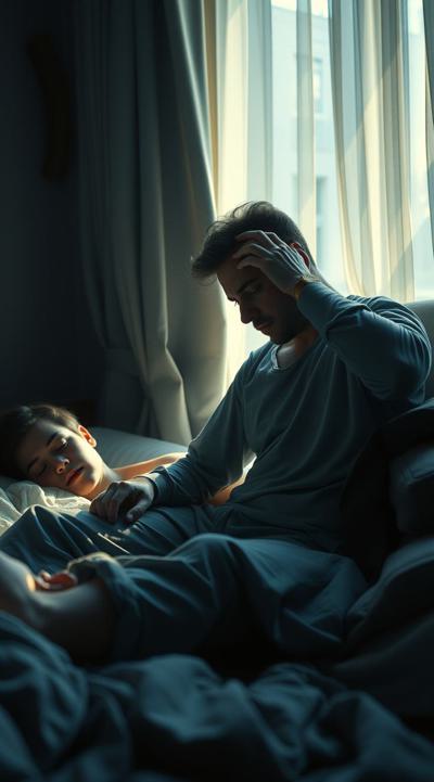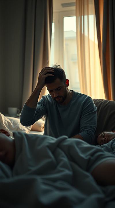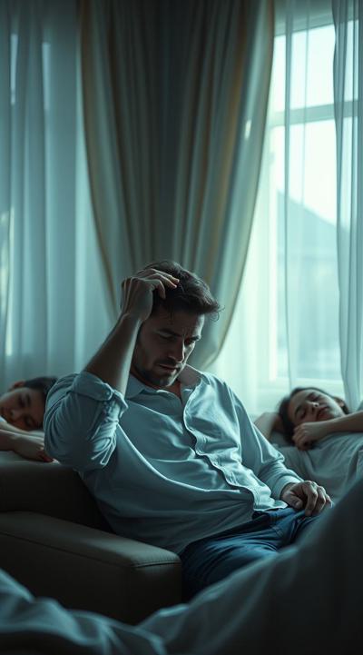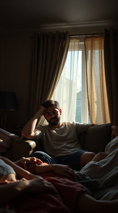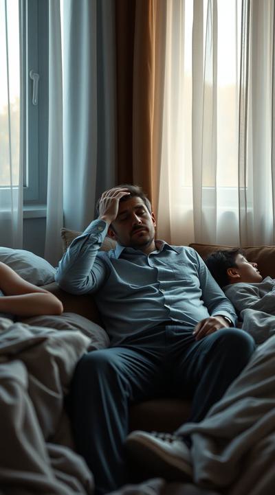 У мужчины похмелье. он сидит в комнате, у него болит голова, он держит рукой голову Вокруг лежат спящие люди. утро в комнате с открытыми шторами