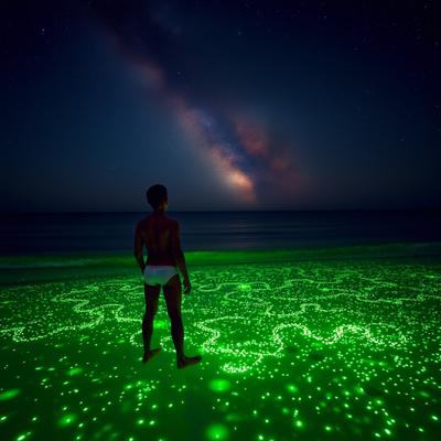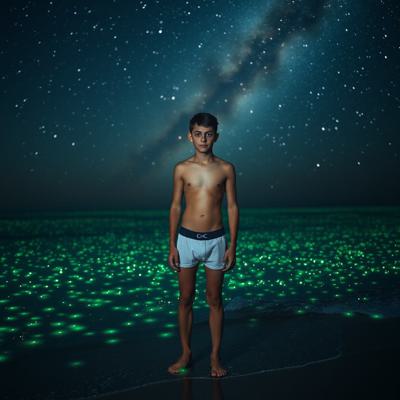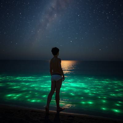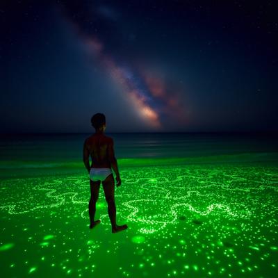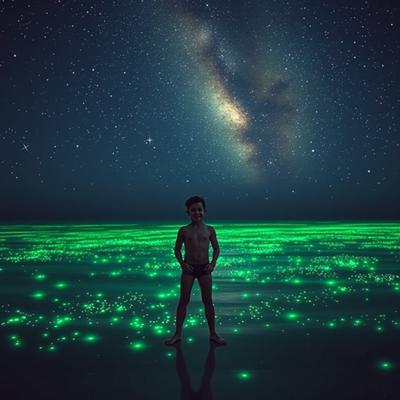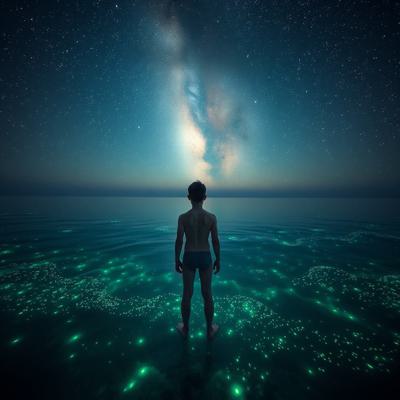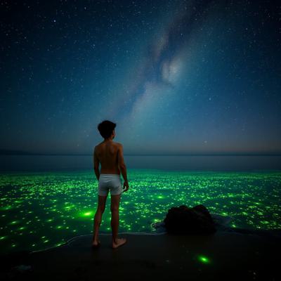все море сделай зеленым, [Уточнение для #5908812 'молодой парень стоит на берегу перед морем в одних трусах Глубокий, размеренный поток звезд, мерцающих в безбрежной ночи, словно тихое сердце вселенной Поверхность воды покрылась зеленым сиянием — микроскопические люминесцентные организмы разгорелись, словно мельчайшие сказочные огоньки, вспыхивающие в бесконечности., , И тут, в дали, на границе с горизонтом, из морских глубин поднялись две необъятные, великолепнейшие змеи — гигантские, радужные, чарующие своей грациозностью. Они т