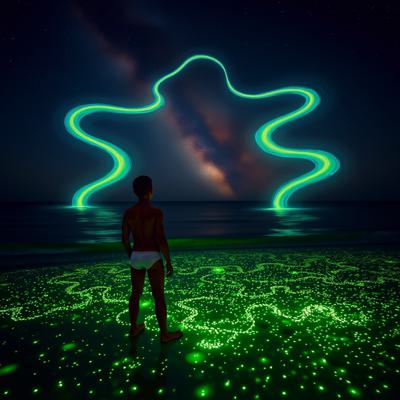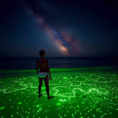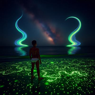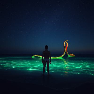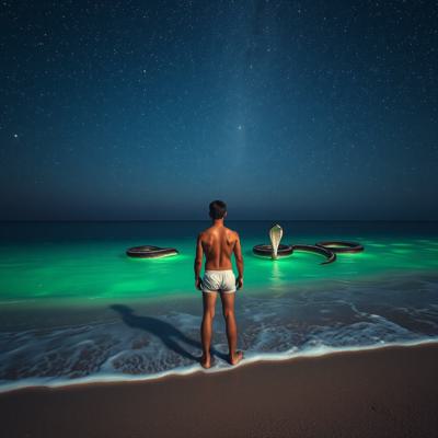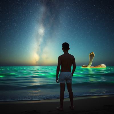 молодой парень стоит на берегу перед морем в одних трусах Глубокий, размеренный поток звезд, мерцающих в безбрежной ночи, словно тихое сердце вселенной Поверхность воды покрылась зеленым сиянием — микроскопические люминесцентные организмы разгорелись, словно мельчайшие сказочные огоньки, вспыхивающие в бесконечности., , И тут, в дали, на границе с горизонтом, из морских глубин поднялись две необъятные, великолепнейшие змеи — гигантские, радужные, чарующие своей грациозностью. Они танцевали в воздухе, расправляли свои яркие тела, пересекаясь и изгибаясь в причудливых узорах, словно живые картины на волшебной сцене.