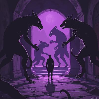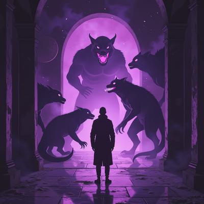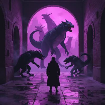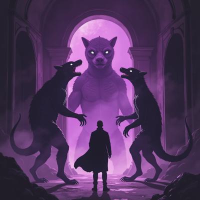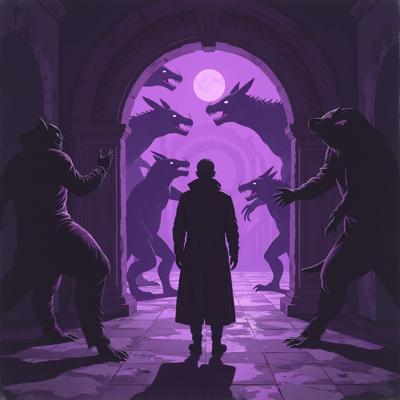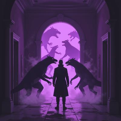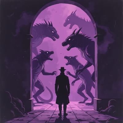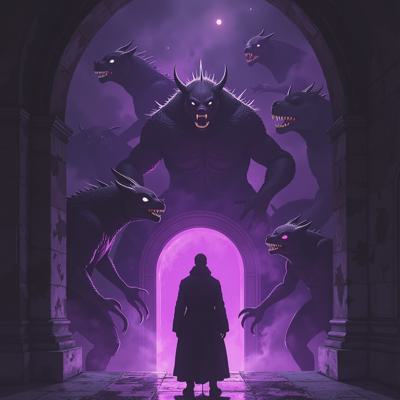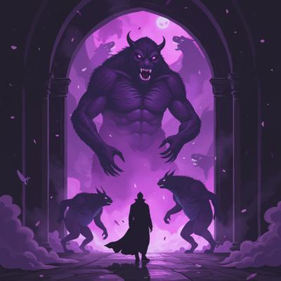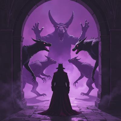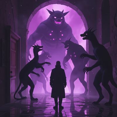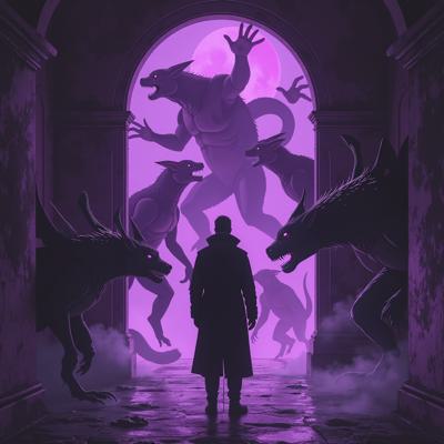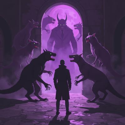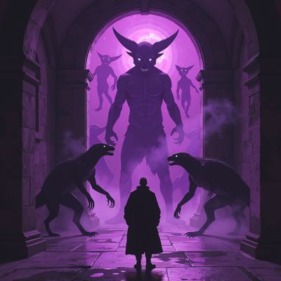 в мрачный зал из фиолетового портала выходят существа ужасного вида а перед ними стоит человек в класическом костюме
