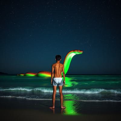 добавь двух огромных радужных змеев у горизонта а также сделай все море зеленым из-за микро организмов что светятся [Уточнение для #5908812 'молодой парень стоит на берегу перед морем в одних трусах Глубокий, размеренный поток звезд, мерцающих в безбрежной ночи, словно тихое сердце вселенной Поверхность воды покрылась зеленым сиянием — микроскопические люминесцентные организмы разгорелись, словно мельчайшие сказочные огоньки, вспыхивающие в бесконечности., , И тут, в дали, на границе с горизонтом, из морских глубин поднялись две необъятные, великолепнейшие змеи — гигантские, радужные, чарующие своей грациозностью. Они т