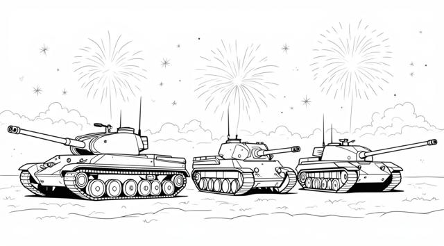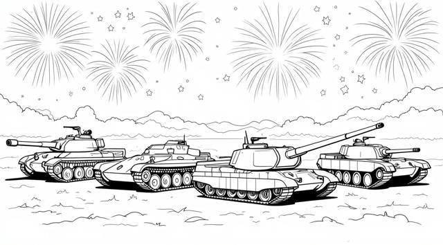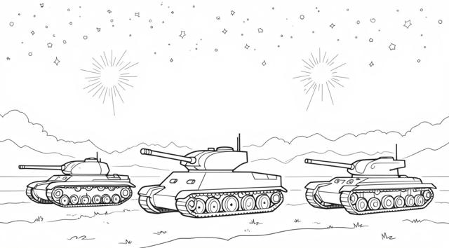 Праздник танков и военных машин, салют, торжество, победа , парад 4 танка , 3 бронированных военных автомобиля, площадь , русские танки и машины , эскизы, черный на белом, полное соответствие картинки и описания ,