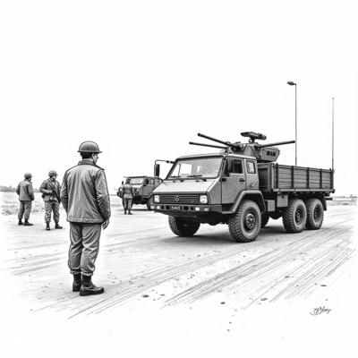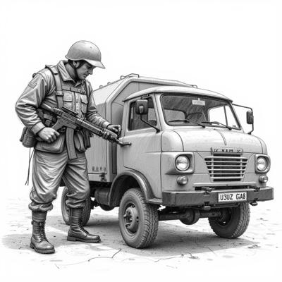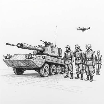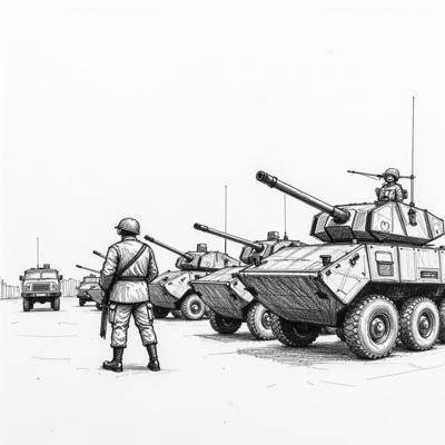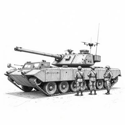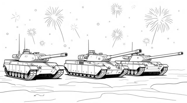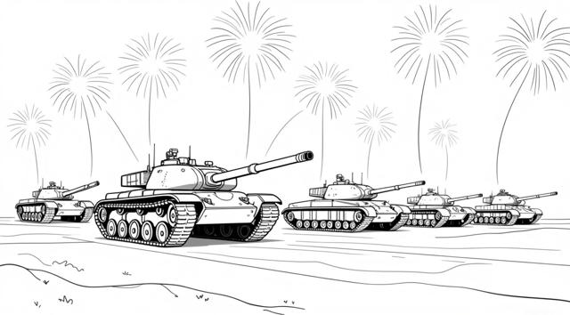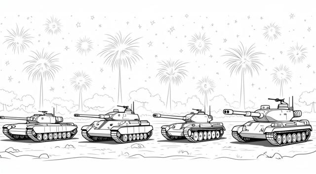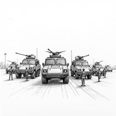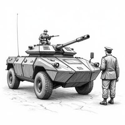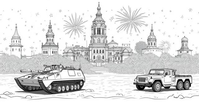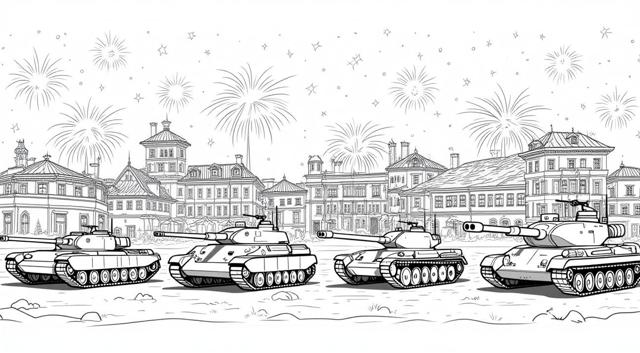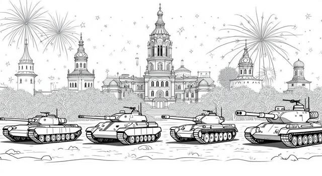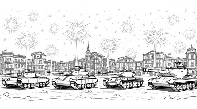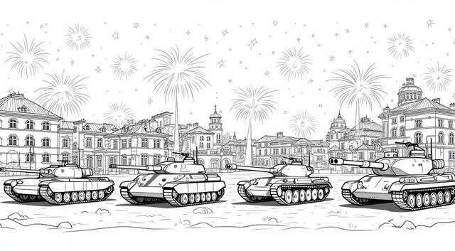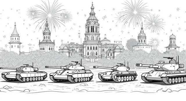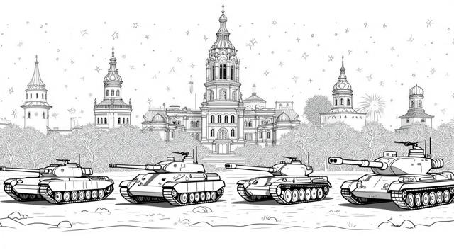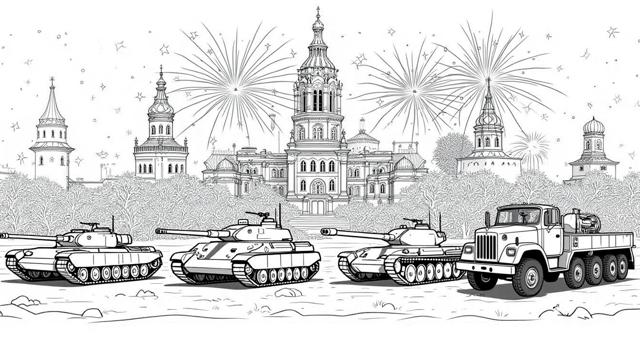 Добавь на задний план растительность , немного зданий в стиле русской архитектуры, и хотя бы одну бронированную военную машину , все русское [Уточнение для #5957192 'Праздник танков и военных машин, салют, торжество, победа , парад 4 танка , 3 бронированных военных автомобиля, площадь , русские танки и машины , эскизы, черный на белом, полное соответствие картинки и описания , ]'
