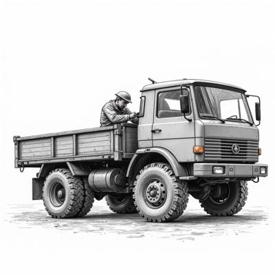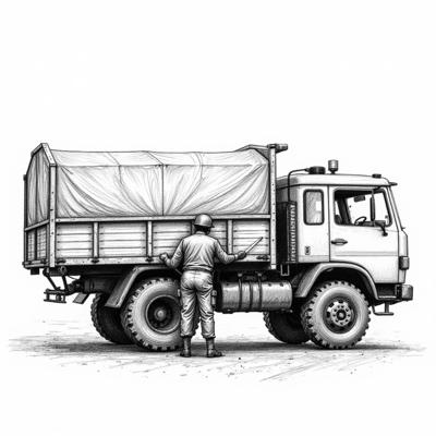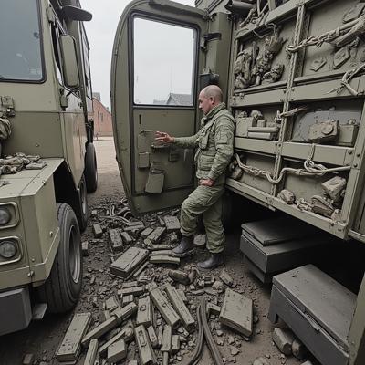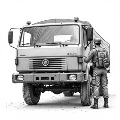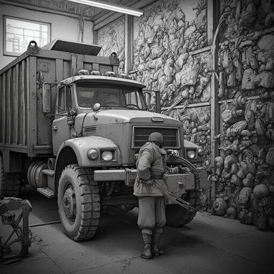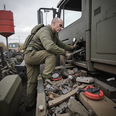 Российский солдат чинит грузовик КамАЗ, много деталей , военный, инструменты