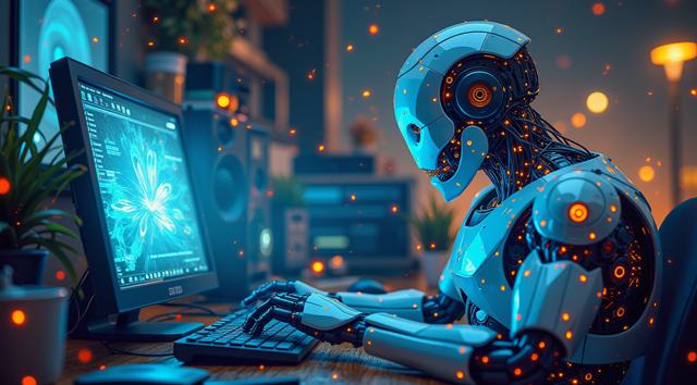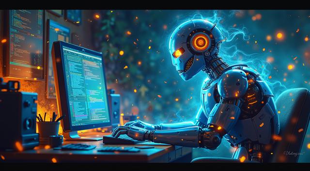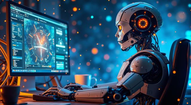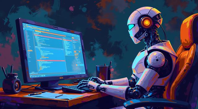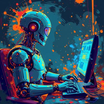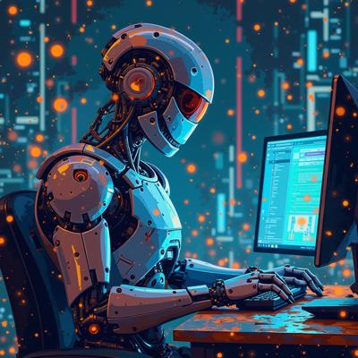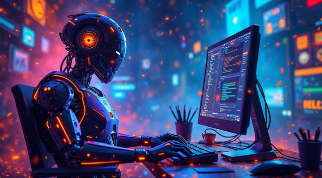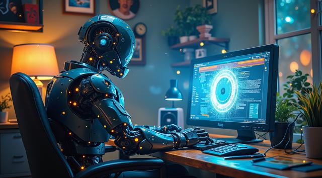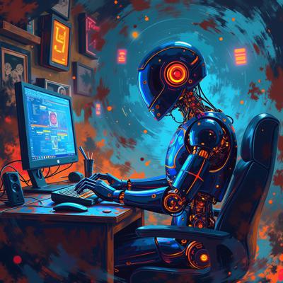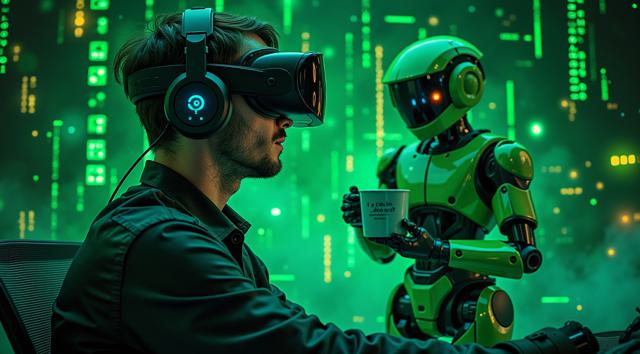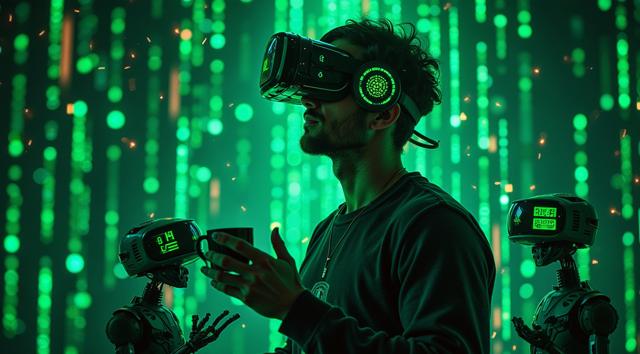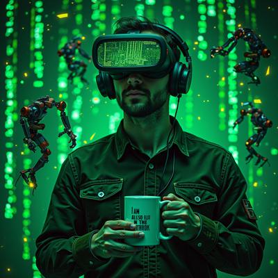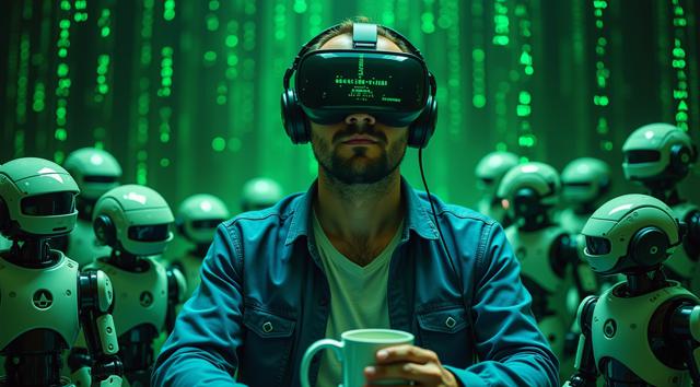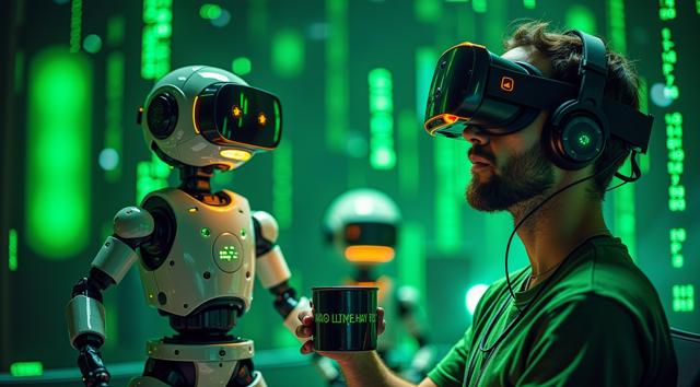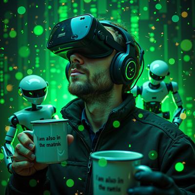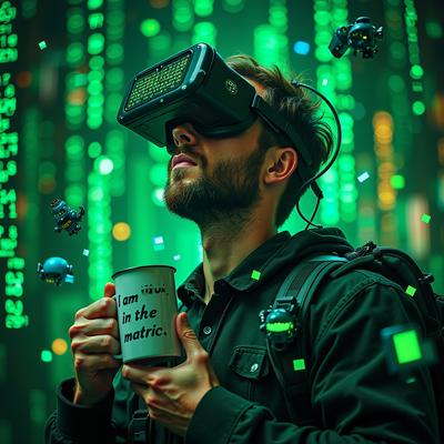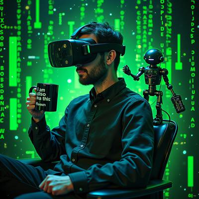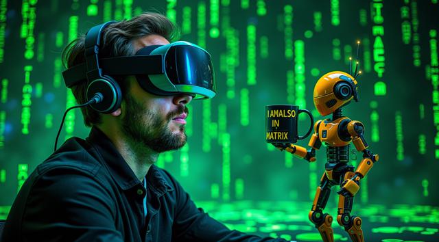 человек в VR-шлеме, вокруг него зеленые коды и мини-роботы, один из которых держит кружку «Я тоже в Матрице».