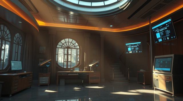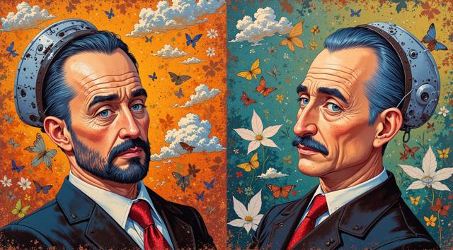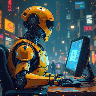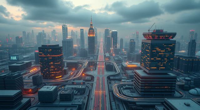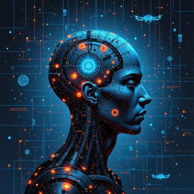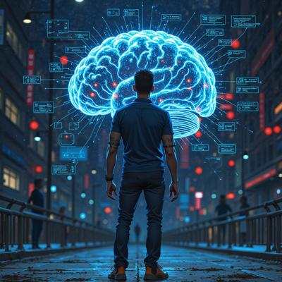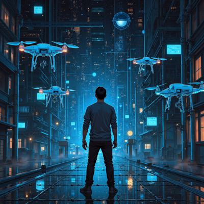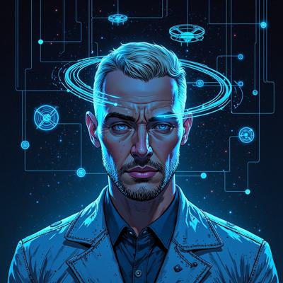 человек в центре, с подключёнными сенсорами нейроимплантами, вокруг него роботы, дроны и цифровые интерфейсы., • Стиль: минималистичный sci-fi, прозрачные линии, легкая анимация «импульсов мозга».