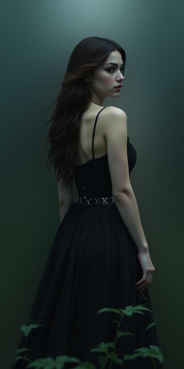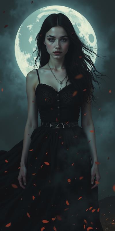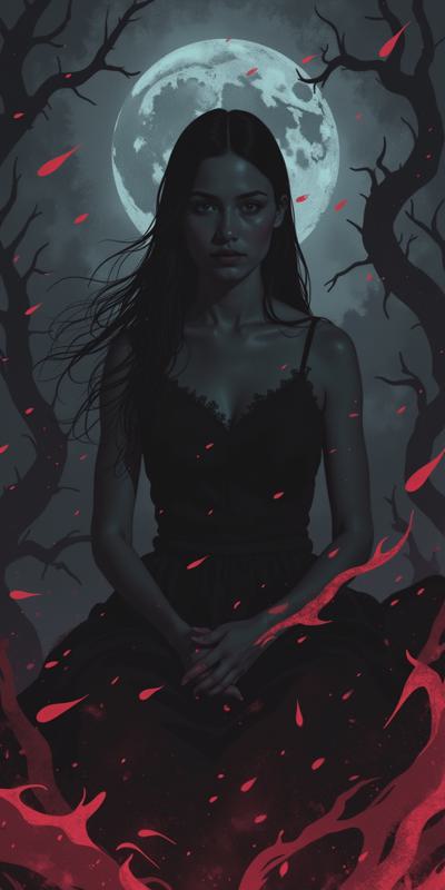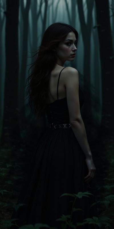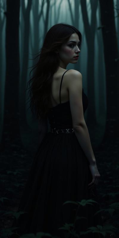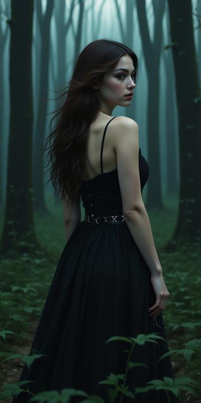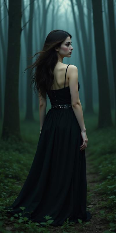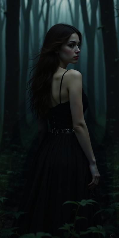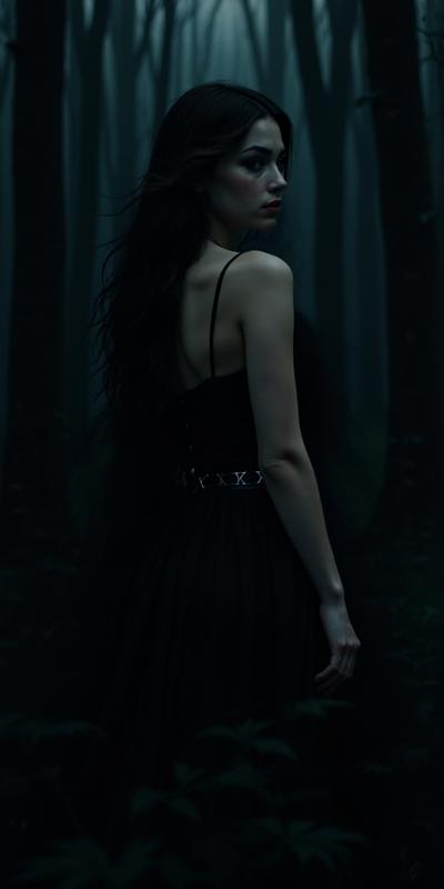 Девушка стоит спиной и волосы у неё каштанового цвета. Уберите Луну на заднем фоне и замени туманным лесом [Уточнение (0.7) для #5885185 'Создай обложку для книги, в которой девушка является сосудом для древней силы. За неё борются небеса и преисподняя. Её жизнь окутана тайнами, обманом и смертью. Её манит тьма. Она буквально находится в объятьях тьмы. ]'
