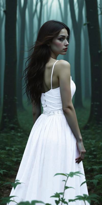 Измени цвет платья на белое [Уточнение (0.7) для #5888101 'Девушка стоит спиной и волосы у неё каштанового цвета. Уберите Луну на заднем фоне и замени туманным лесом [Уточнение (0.7) для #5885185 'Создай обложку для книги, в которой девушка является сосудом для древней силы. За неё борются небеса и преисподняя. Её жизнь окутана тайнами, обманом и смертью. Её манит тьма. Она буквально находится в объятьях тьмы. ]']'