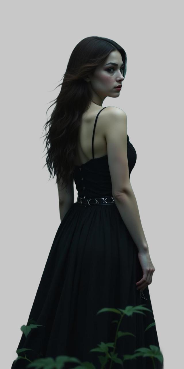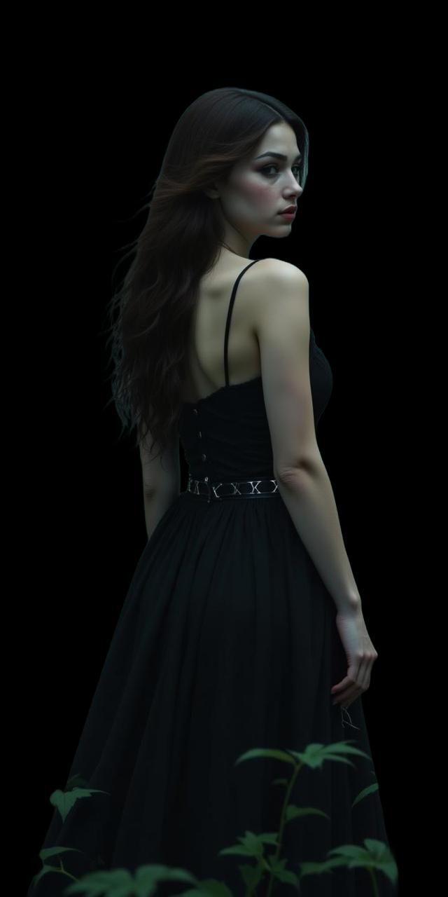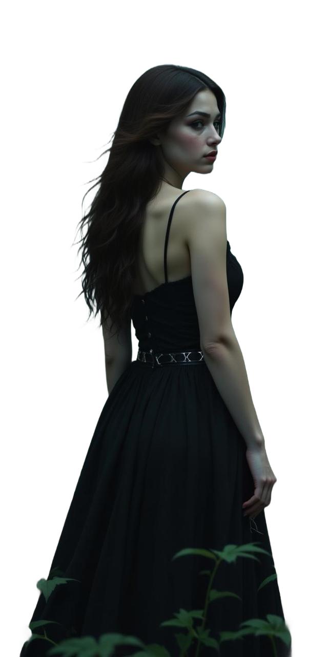 [Без фона #5888101 'Девушка стоит спиной и волосы у неё каштанового цвета. Уберите Луну на заднем фоне и замени туманным лесом [Уточнение (0.7) для #5885185 'Создай обложку для книги, в которой девушка является сосудом для древней силы. За неё борются небеса и преисподняя. Её жизнь окутана тайнами, обманом и смертью. Её манит тьма. Она буквально находится в объятьях тьмы. ]']'