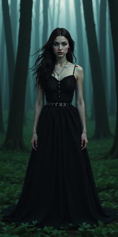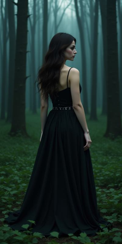 Снизу девушку окутывают волны черно-прозрачной дымки и доходят до талии [Уточнение (0.6) для #5888101 'Девушка стоит спиной и волосы у неё каштанового цвета. Уберите Луну на заднем фоне и замени туманным лесом [Уточнение (0.7) для #5885185 'Создай обложку для книги, в которой девушка является сосудом для древней силы. За неё борются небеса и преисподняя. Её жизнь окутана тайнами, обманом и смертью. Её манит тьма. Она буквально находится в объятьях тьмы. ]']'