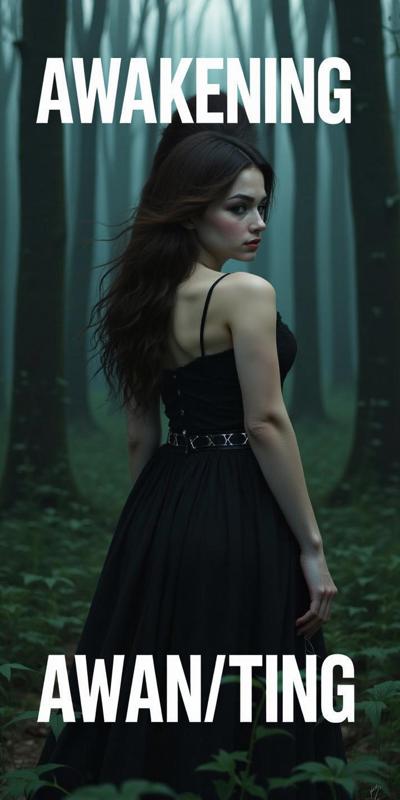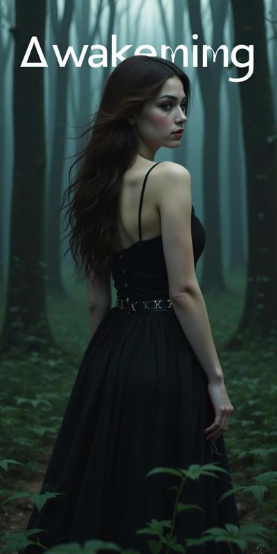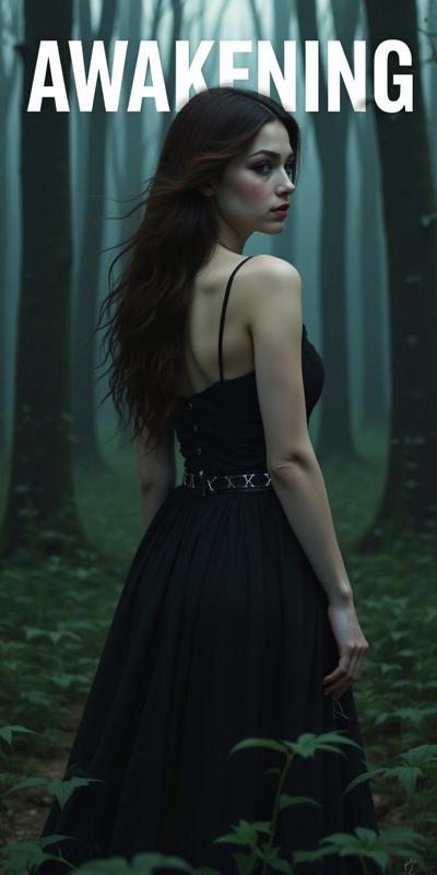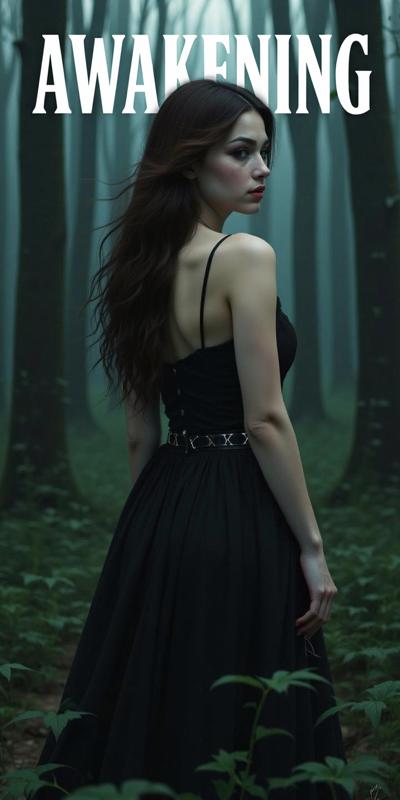 Сделай как обложка для книги Пробуждение [Уточнение (0.5) для #5888101 'Девушка стоит спиной и волосы у неё каштанового цвета. Уберите Луну на заднем фоне и замени туманным лесом [Уточнение (0.7) для #5885185 'Создай обложку для книги, в которой девушка является сосудом для древней силы. За неё борются небеса и преисподняя. Её жизнь окутана тайнами, обманом и смертью. Её манит тьма. Она буквально находится в объятьях тьмы. ]']'