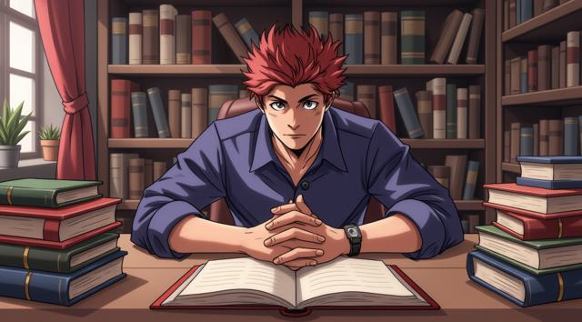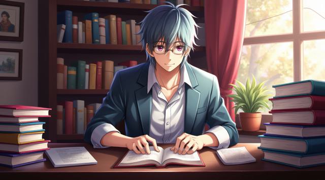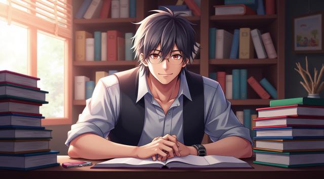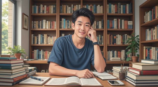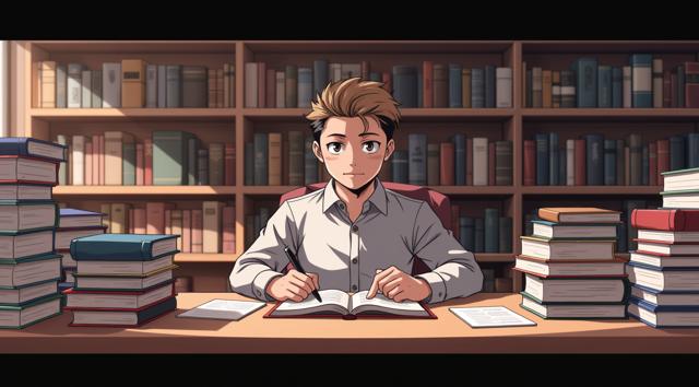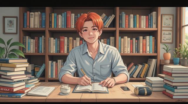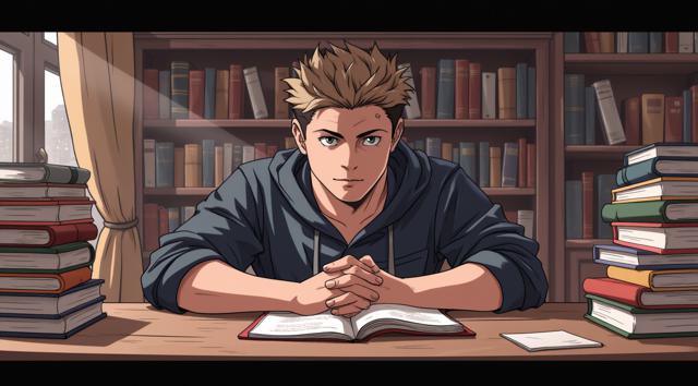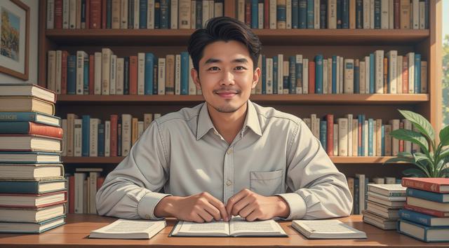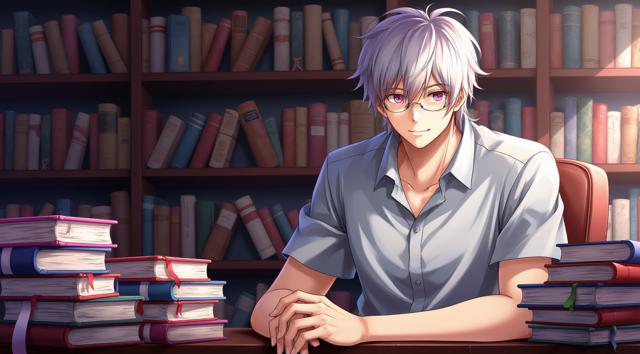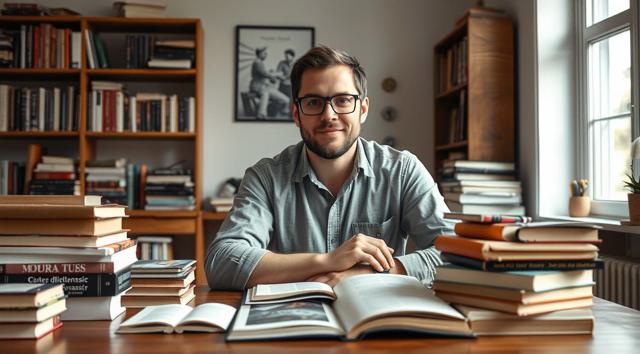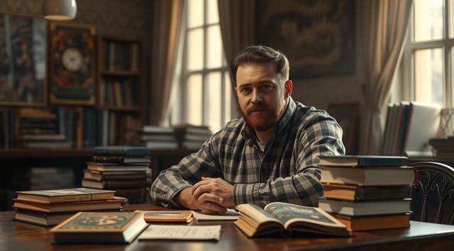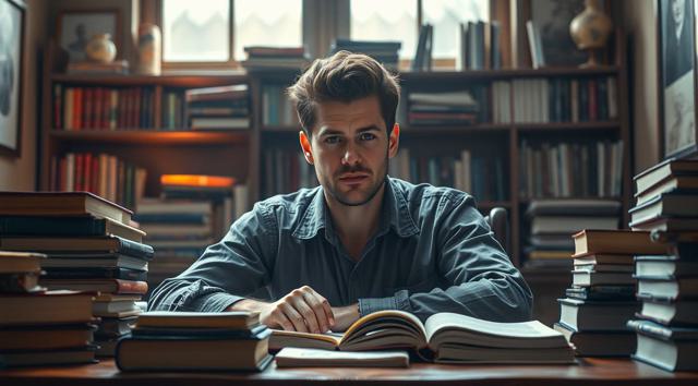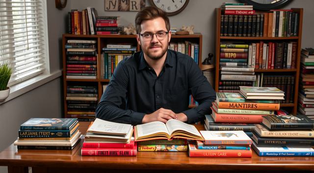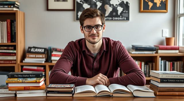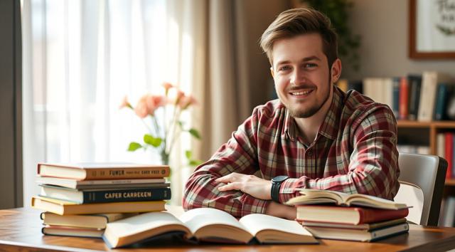 Парень 30 лет сидит за столом, на котором стоят много разных книг