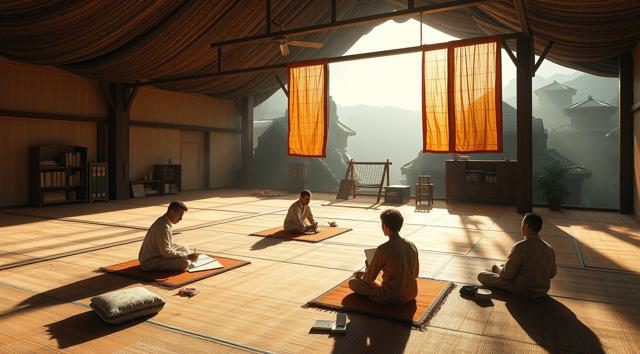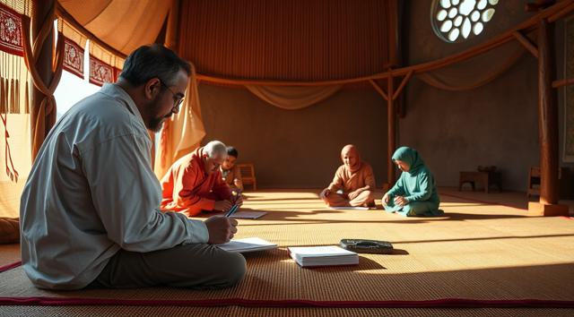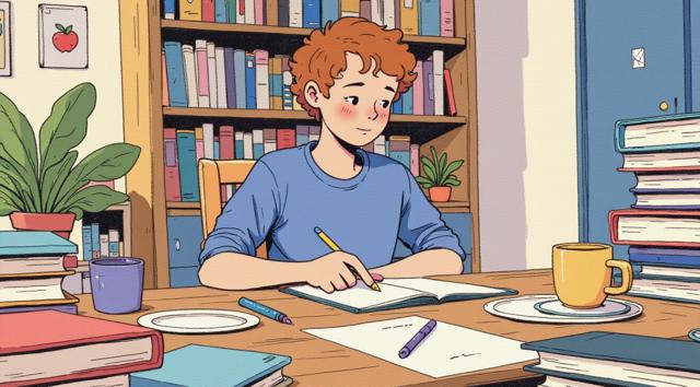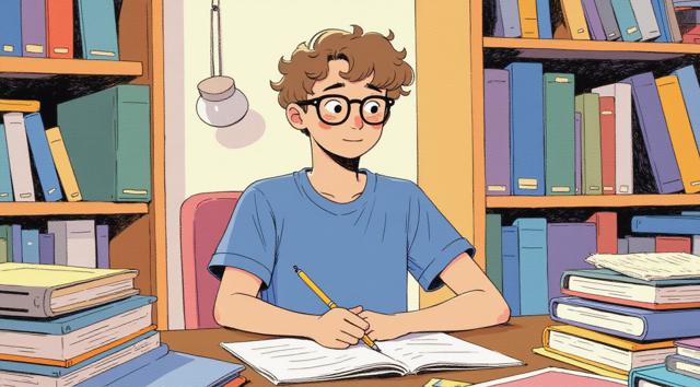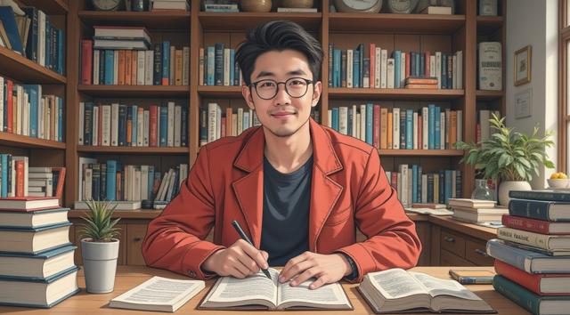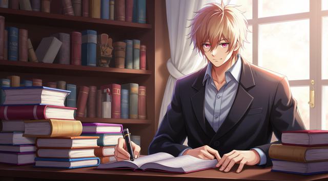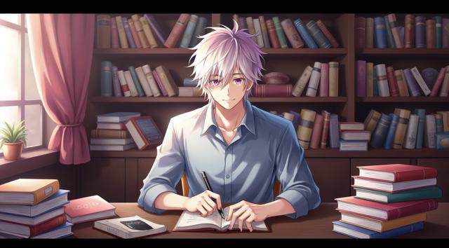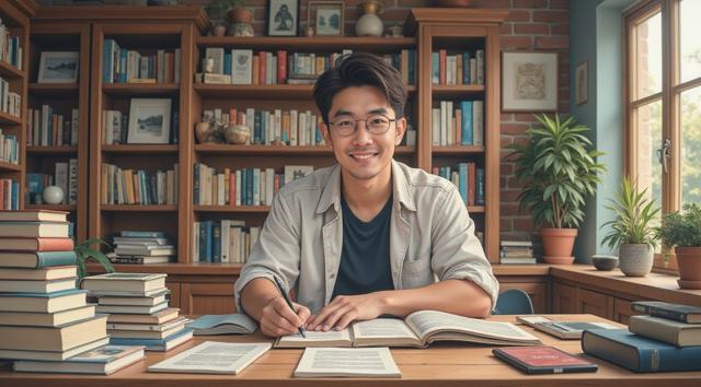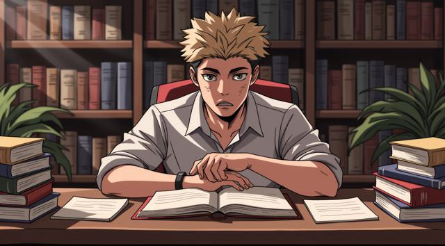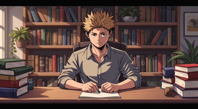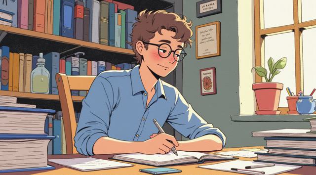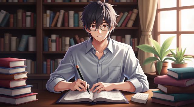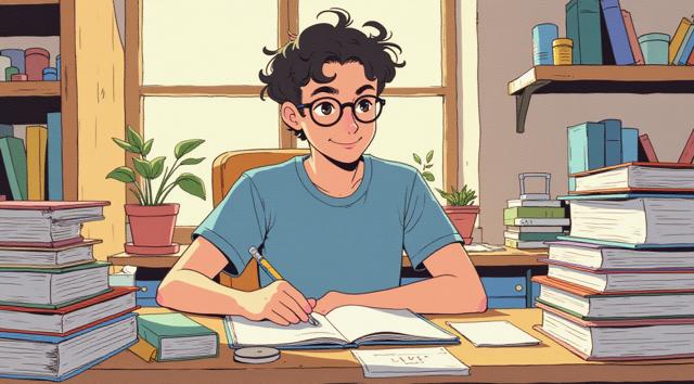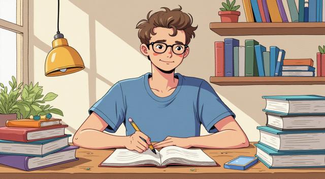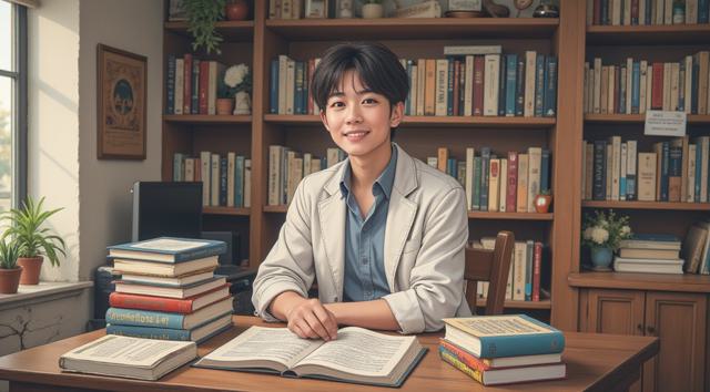 Парень 30 лет сидит за столом, на котором стоят много разных книг