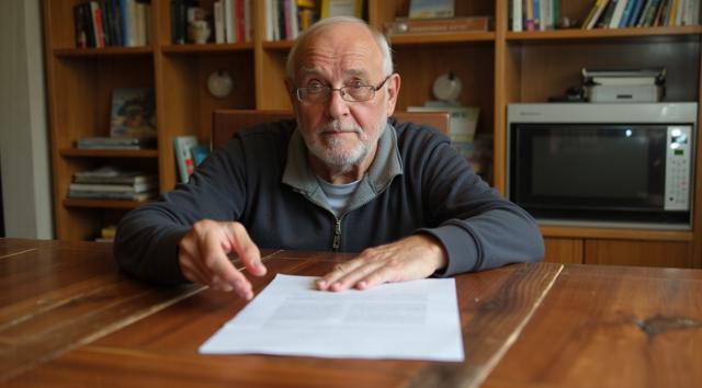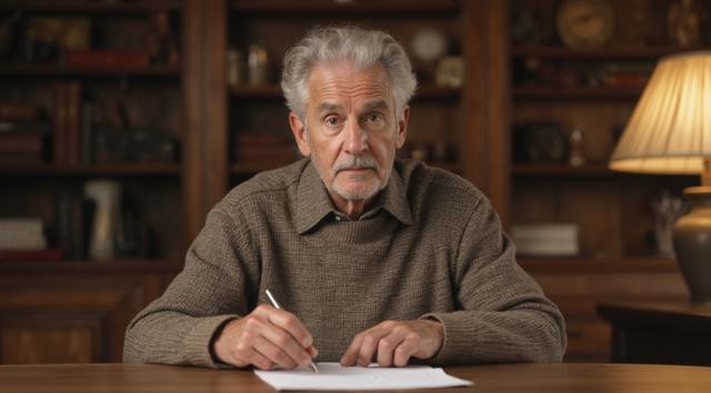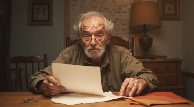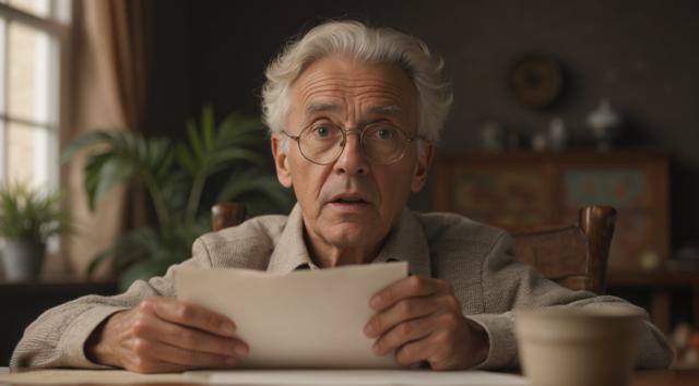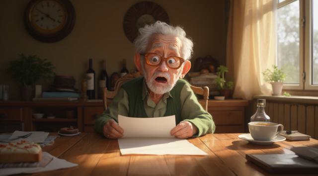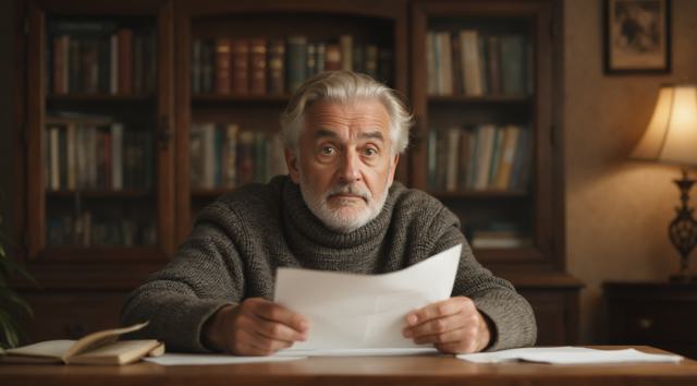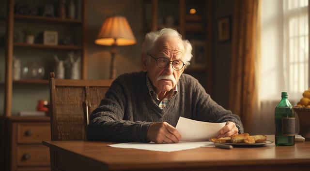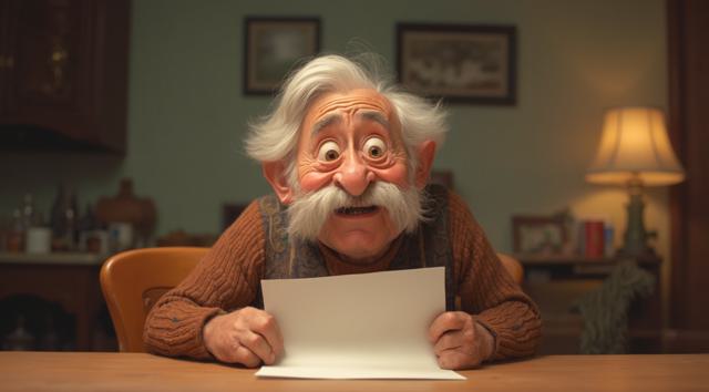 Дедушка сидит за столом. В рука держит лист бумаги. Лицо дедушки удивленное